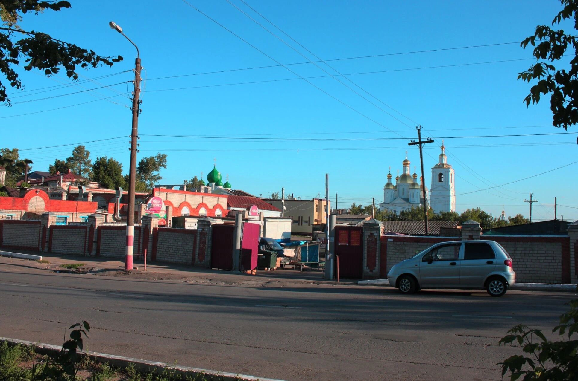 На среднем плане расположены частные жилые дома и строения, огороженные заборами, а также протянутые над улицей провода линий электропередачи, что создаёт атмосферу провинциального уездного города.