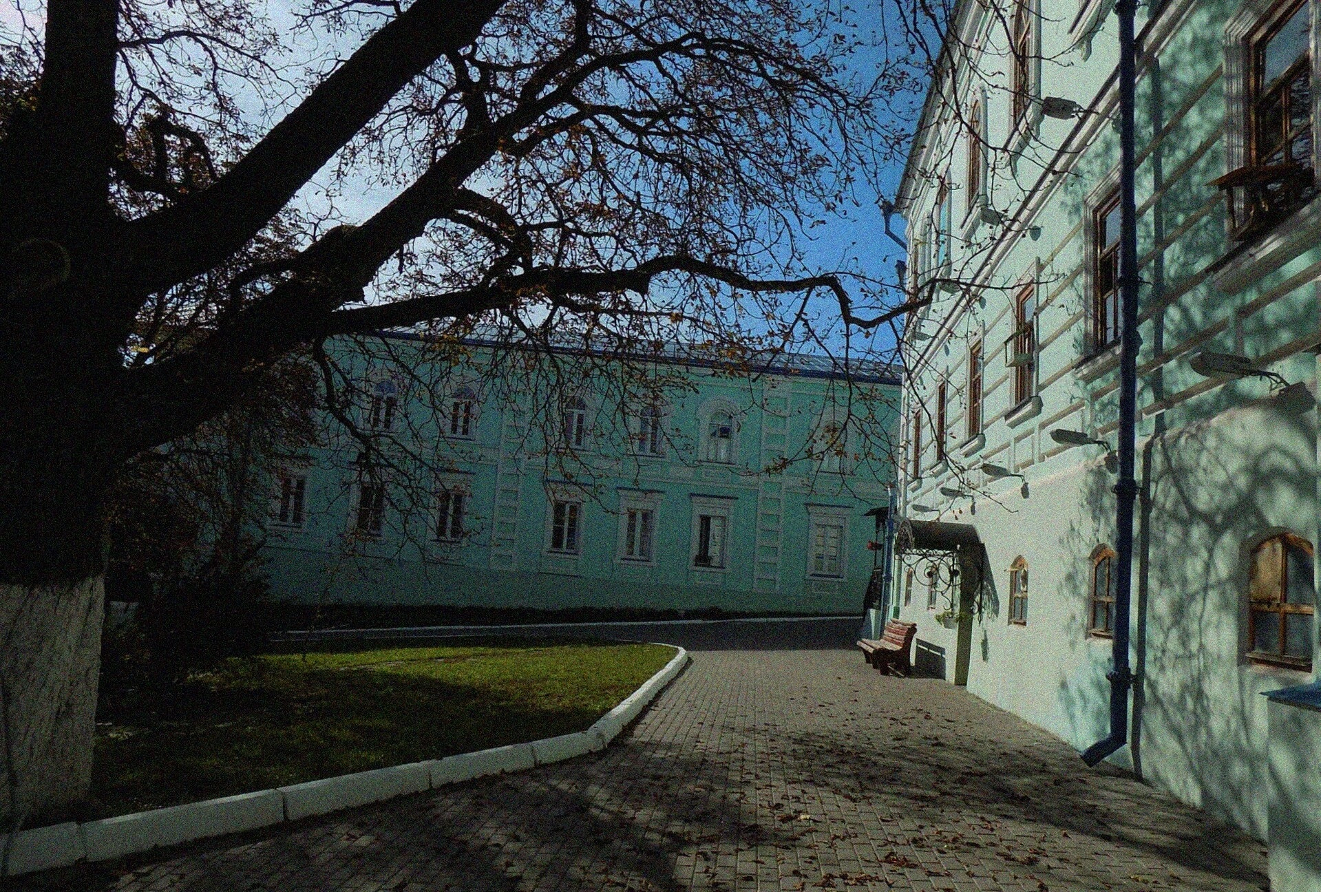 Между деревом и зданием уходит вглубь мощёная дорожка, усыпанная осенней листвой, ведущая взгляд ко второму, аналогичному зданию на заднем плане. Всё это открывается под сенью чистого голубого неба, создающего ощущение покоя и умиротворения, свойственного этому святому месту. Монастырь, основанный на месте чудесного обретения Курской Коренной иконы Божией Матери «Знамение» в XIII столетии, является одной из главных духовных жемчужин всего Курского края и привлекает множество паломников.