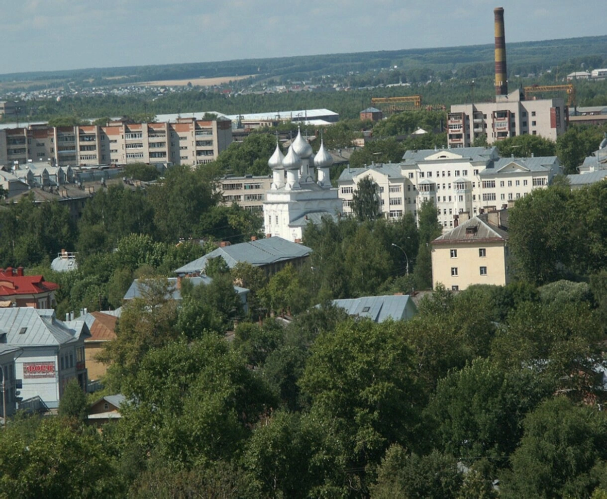 На представленной фотографии запечатлён прекрасный панорамный вид на древний город Вологда, открывающийся предположительно с колокольни одного из храмов или высотного здания. Центральным объектом снимка является величественный храм во имя Святых Равноапостольных Царя Константина и матери его Царицы Елены, расположенный в историческом районе города, известном как Верхний Посад.