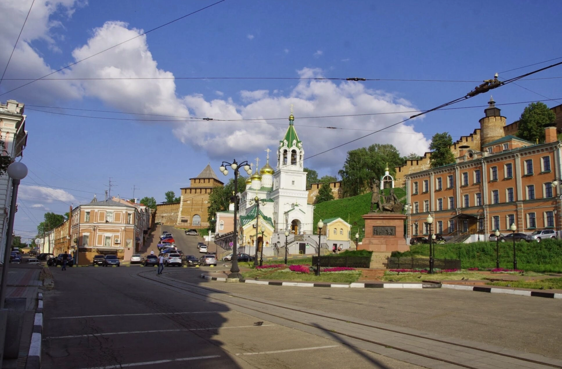 На переднем плане проходит улица Рождественская, одна из старейших в городе, с проложенными трамвайными путями. Её благоустройство подчёркивается аккуратными фонарными столбами и цветущими клумбами, что добавляет сцене жизненной динамики и уюта. Чистое небо с облаками, освещающее весь ансамбль мягким светом, подчёркивает величие и благодатность этого места, являющегося сердцем нижегородской земли.