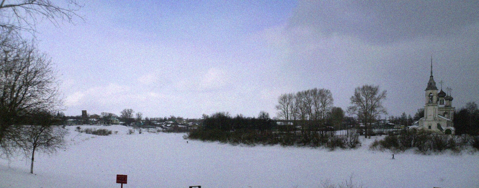 Просторы замерзшей реки, покрытые нетронутым снежным покровом, создают ощущение благоговейной тишины и спокойствия, характерных для зимней природы русского севера. По берегам реки видны деревья, сквозь оголённые ветви которых просматриваются скромные деревянные постройки близлежащего поселения. Пасмурное небо с низкими облаками усиливает атмосферу зимнего дня и подчёркивает строгую красоту православной святыни.