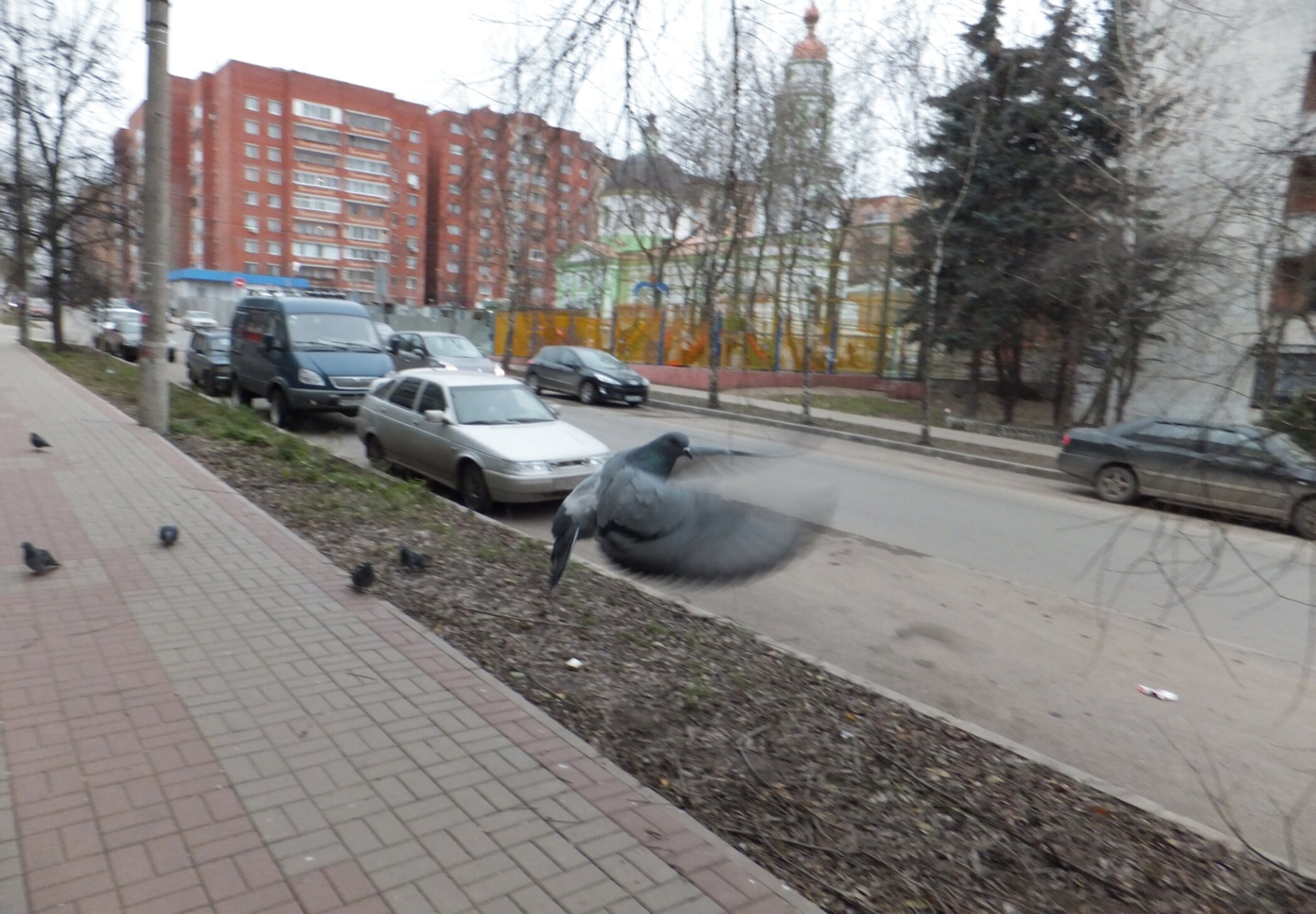 На представленной фотографии запечатлён вид одной из улиц древнего града Калуги в осенне-зимний период. Снимок сделан в пасмурный день, что придаёт изображению особое, сдержанное звучание и напоминает о бренности земной жизни. На переднем плане, справа, виден голубь в полёте с расправленными крыльями, символизирующий дух, устремлённый к небесам. Рядом на тротуаре и земле расположились другие голуби, сии Божии птицы, столь почитаемые в православной традиции.