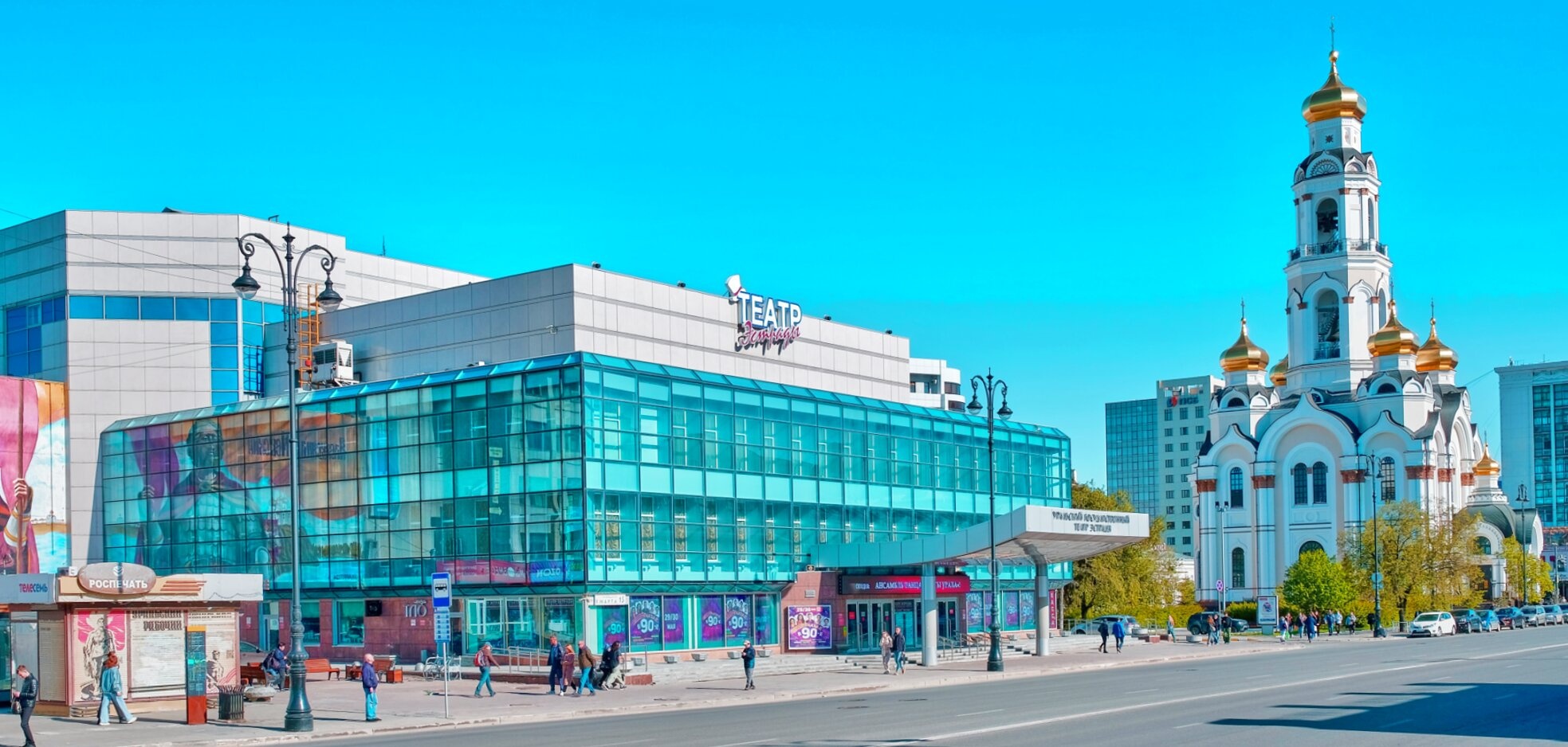 Слева от храма расположено современное здание Уральского государственного театра эстрады, контрастирующее своей лаконичной стеклянной архитектурой с историческим обликом православной святыни. Этот архитектурный ансамбль ярко иллюстрирует многогранность уральской столицы, где переплетаются история и современность.