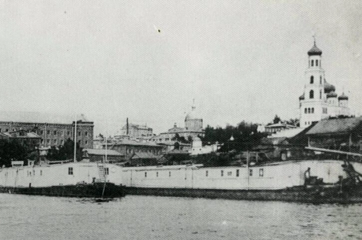На представленной исторической фотографии запечатлён величественный вид Самарского Иверского женского монастыря, возвышающегося на берегу полноводной реки Волги. Снимок передаёт благоговейную атмосферу этого намоленного места, являвшегося в XIX и начале XX веков одной из главных православных святынь Самары и всего Поволжья.