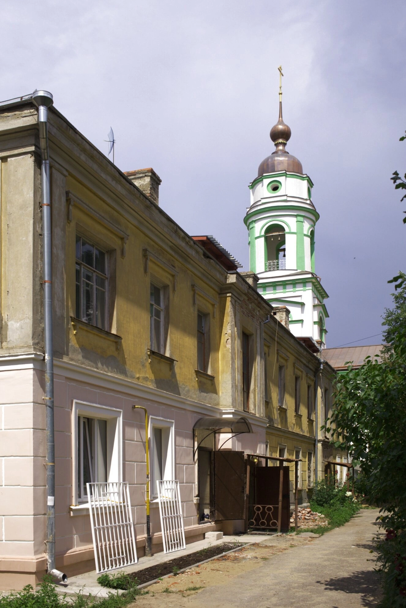 В перспективе улицы величественно возвышается стройная колокольня с зелёным куполом, увенчанным сияющим золотым крестом, который устремлён в небеса. Этот храм является одной из духовных жемчужин Калуги, а его колокольня служит ориентиром и неотъемлемой частью исторического силуэта города.