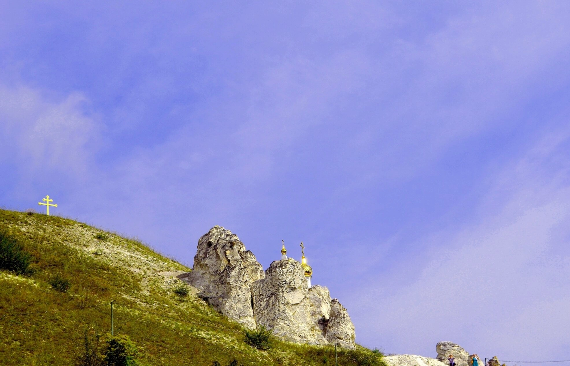 На вершине одного из холмов, который в благочестивой традиции называют Голгофой, установлен деревянный поклонный крест. Он осеняет собой всю округу, напоминая о жертвенном подвиге Спасителя и призывая путников к молитве. У подножия див располагается древняя православная святыня — Свято-Успенский Дивногорский мужской монастырь. Золотые купола его храмов, сияющие под ясным голубым небом, гармонично вписаны в меловые скалы, демонстрируя удивительное единение творения рук человеческих и Божественного творения.