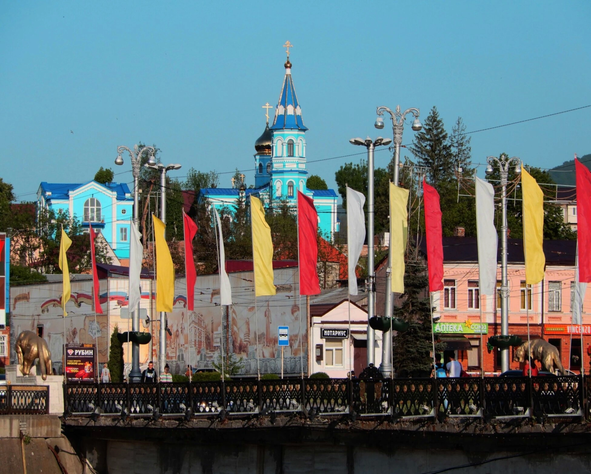 За храмом простирается панорама городской застройки, где среди прочих зданий можно различить вывески «НОТАРИУС» и «РУБИН». Река Терек, несущая свои воды у подножия храма, добавляет пейзажу динамики и величия. Мост через реку, украшенный цветными флагами, служит не только важной транспортной артерией, но и связующим звеном между светской жизнью города и его духовной обителью.