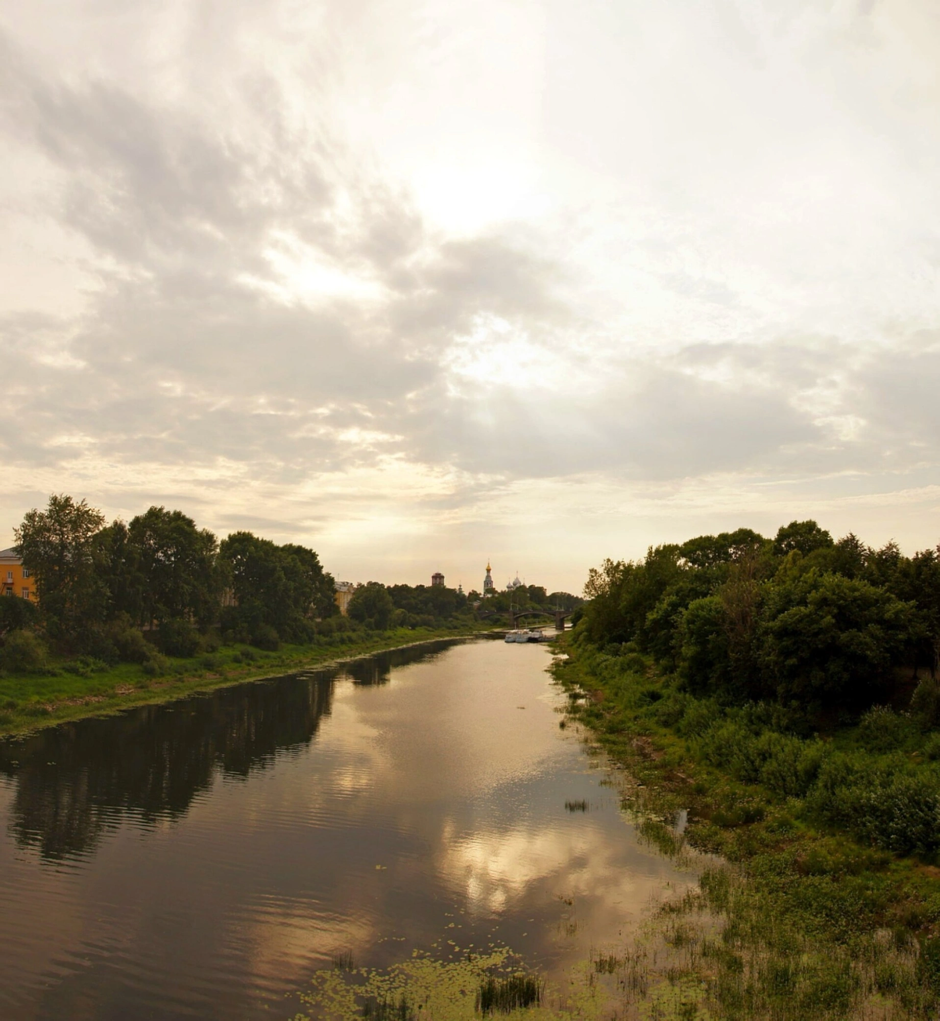 Берега реки обильно поросли древесной растительностью, создавая живописный природный оклад для святыни. Пасмурное небо с разрывами в облаках, сквозь которые пробиваются лучи вечернего солнца, наполняет снимок особой атмосферой духовной сосредоточенности и благоговения перед вечной красотой православной архитектуры.
