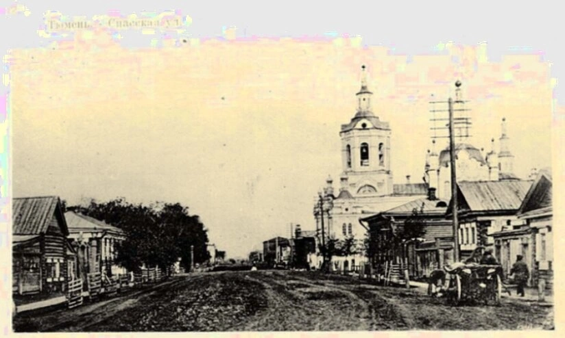 На представленной исторической фотографии запечатлён вид одной из улиц дореволюционной Тюмени, открывающийся в направлении величественного православного храма — Церкви Спаса Нерукотворного Образа, являющейся смысловым и композиционным центром снимка. Святыня, возвышающаяся над малоэтажной городской застройкой, демонстрирует характерные для русского церковного зодчества черты: мощный четверик, увенчанный пятиглавием, и высокую шатровую колокольню, которая служит вертикальной доминантой всей округи.