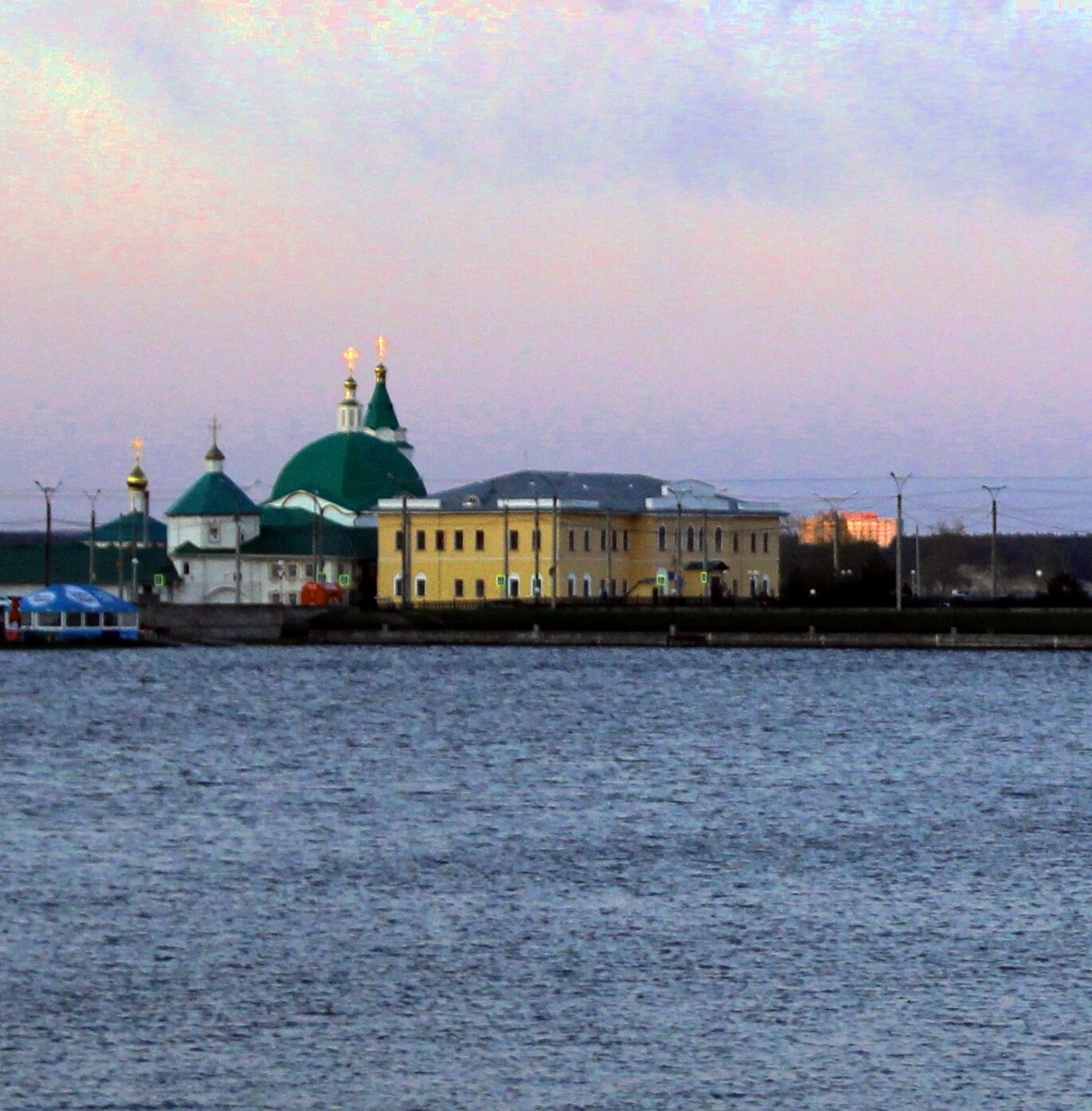 На представленной фотографии запечатлён величественный вид на береговой ансамбль города Чебоксары с акватории реки Волги. Центральное место в композиции занимает Свято-Троицкий мужской монастырь, основанный в XVI веке по указу царя Ивана Грозного. Монастырский комплекс, увенчанный зелёными куполами, является одной из древнейших православных обителей Чувашии и духовным центром всего Поволжья. Его архитектура воплощает в себе многовековую историю русского монастырского зодчества.