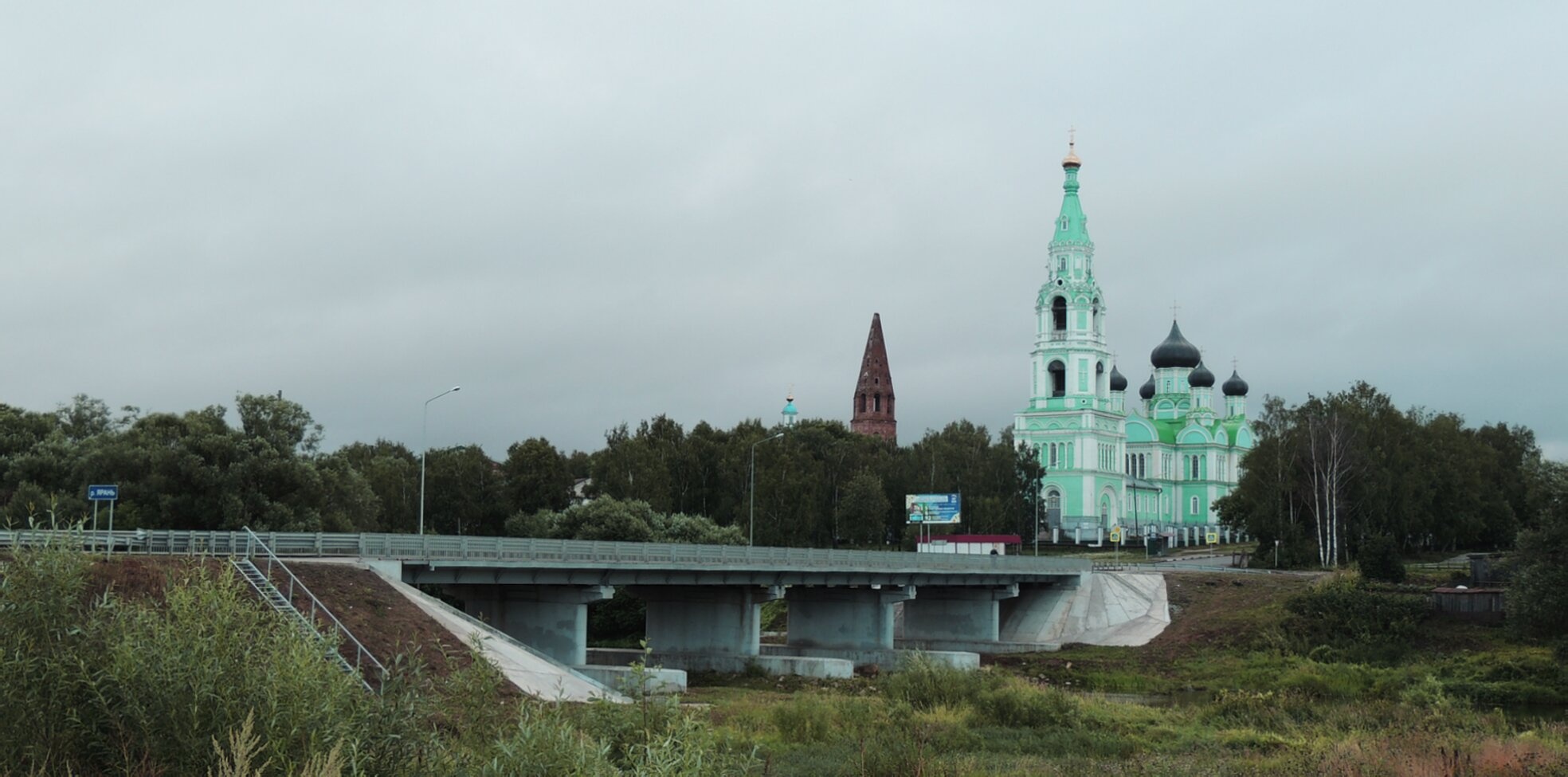 На переднем плане изображён мост, перекинутый через тихую речную гладь, обрамлённую сочной зеленью деревьев. Водная преграда, традиционно символизирующая в христианской традиции переход из мира суетного в мир горний, ведёт взор к главной доминанте пейзажа — величественному Свято-Троицкому собору, возносящему свои бирюзовые главы и стройную колокольню к небу. Храм, освящённый во имя Пресвятой Троицы, является духовным центром города и выдающимся памятником церковной архитектуры второй половины XIX века.