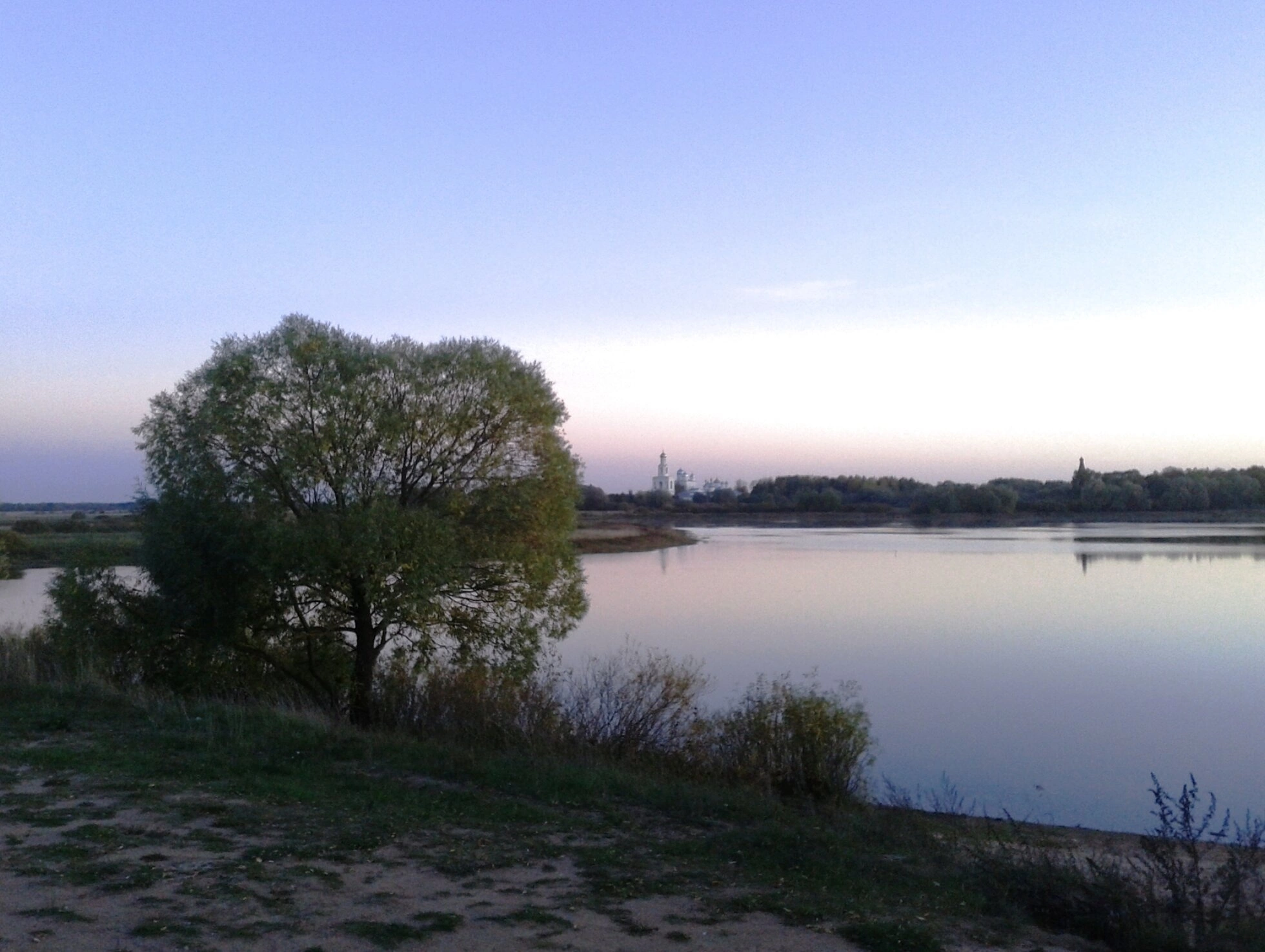 На противоположном берегу, в лучах уходящего дня, возвышаются святые стены и купола одной из древнейших русских обителей. Чётко просматривается монументальный соборный комплекс с колокольней, доминирующий в окружающем ландшафте. Монастырь, основанный в глубокой древности, является не только духовным центром, но и выдающимся памятником церковного зодчества, символизирующим непрерывность православной традиции.