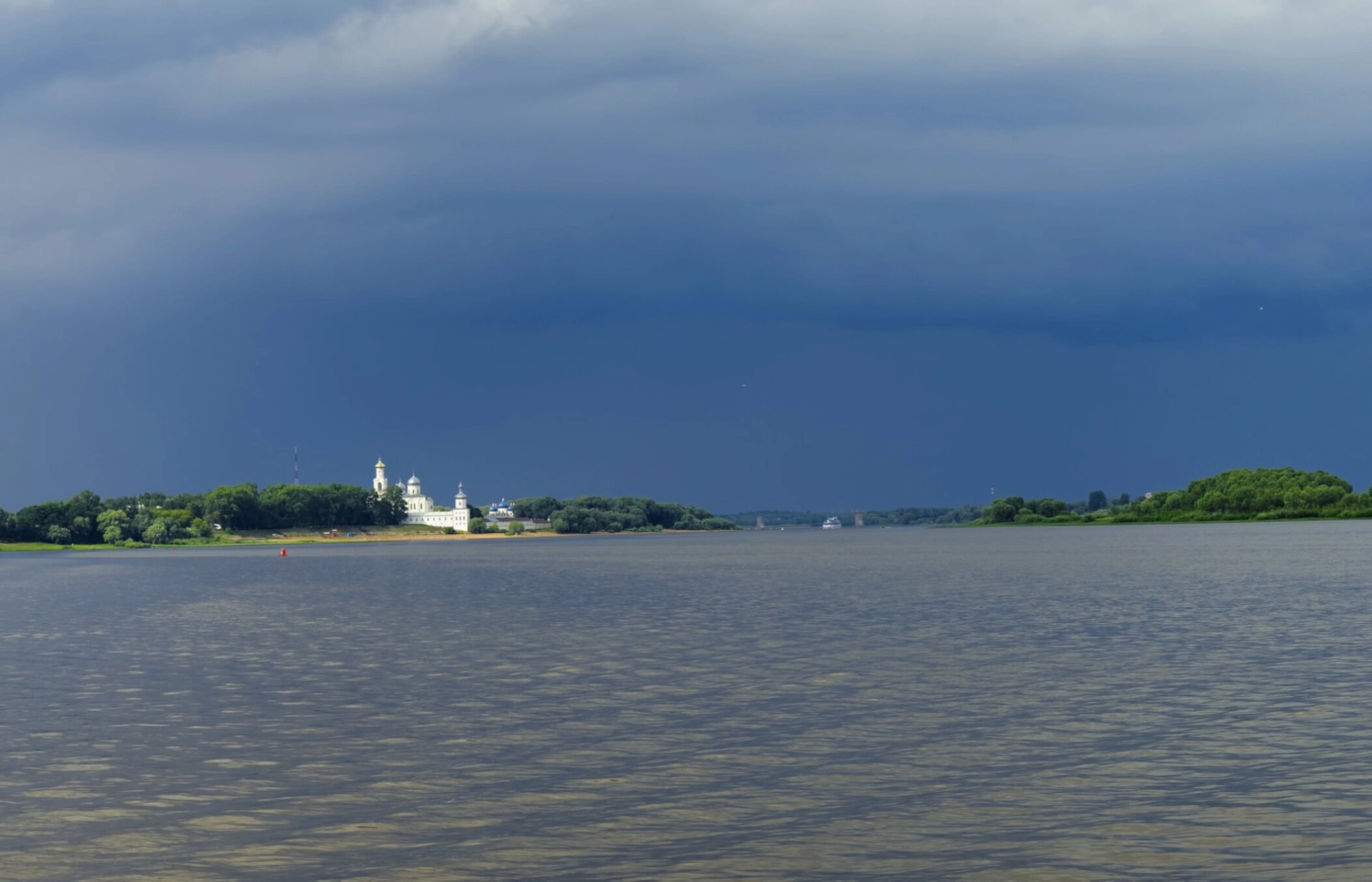 На представленной фотографии запечатлён величественный вид на одну из древнейших православных обителей Руси — Свято-Юрьев мужской монастырь, что расположился на берегу реки Волхов близ Великого Новгорода. Снимок сделан с водной глади, открывая прекрасный ракурс на весь архитектурный ансамбль святой обители, утопающий в зелени и отражающийся в спокойных водах реки.