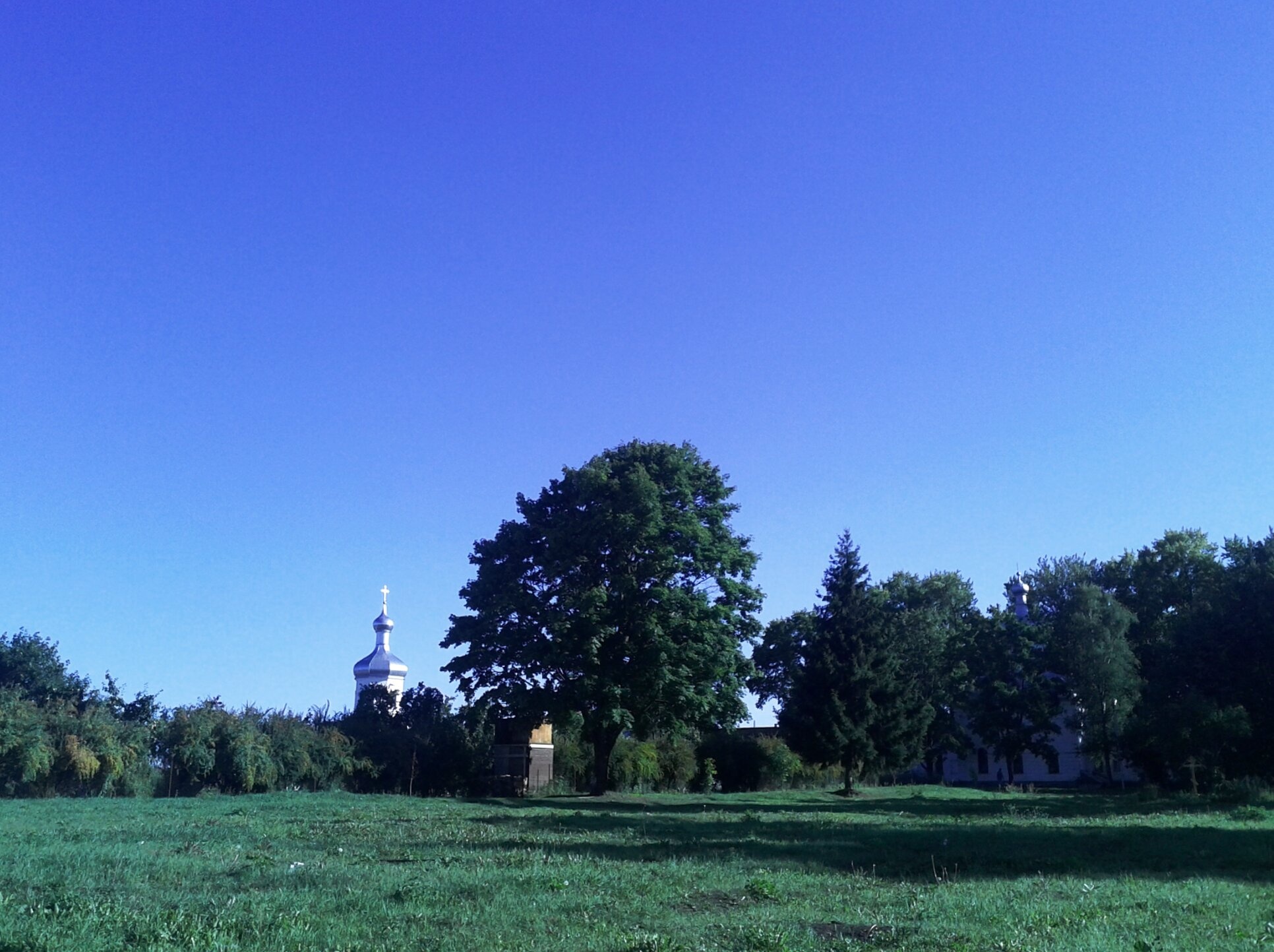 Обитель окружена буйной растительностью: могучие лиственные и хвойные деревья обрамляют её, создавая ощущение незыблемости и вечности этого святого места. В ясный безоблачный день архитектурный ансамбль монастыря, включающий в себя несколько храмов и жилых корпусов, предстает во всем своем духовном величии и спокойствии, символизируя собой непреходящие православные традиции и силу русской веры. Этот образ наполнен благодатью и тихой, глубокой радостью, напоминая о богатейшем историческом и духовном наследии Русской Православной Церкви.