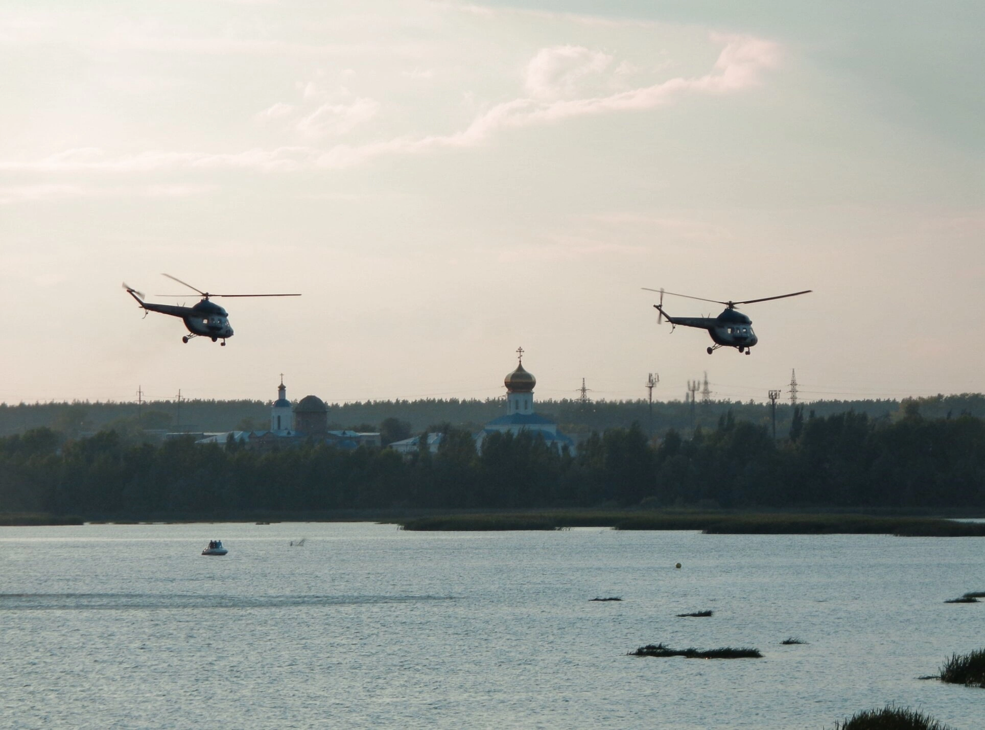 На переднем плане, над водной гладью великой русской реки Волги, застыли в полёте два вертолёта Ми-2, что придаёт кадру динамику и особый масштаб. На берегу, среди обильной зелени деревьев, возвышается ансамбль Сызранского Вознесенского монастыря, основанного в середине XVII века. Белоснежные стены храмов и золотые купола, сияющие на солнце, создают неповторимый архитектурный образ православной святыни.