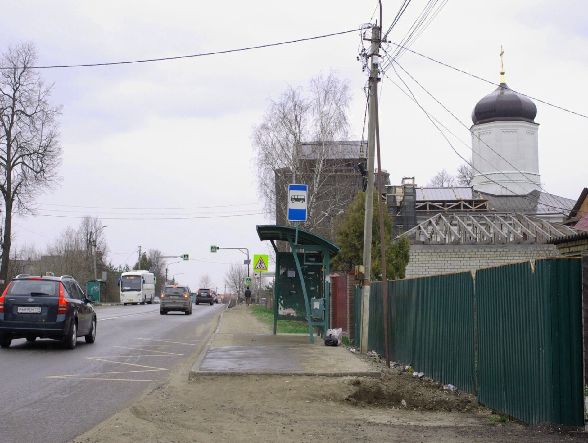 На представленной фотографии запечатлён вид улицы в историческом посёлке Гжель, известном всему миру своими традициями гончарного искусства и православными святынями. На переднем плане изображена асфальтированная проезжая часть, вдоль которой расположен тротуар с зелёным павильоном автобусной остановки. Справа от остановки установлен предупреждающий дорожный знак, призывающий к вниманию и осторожности.