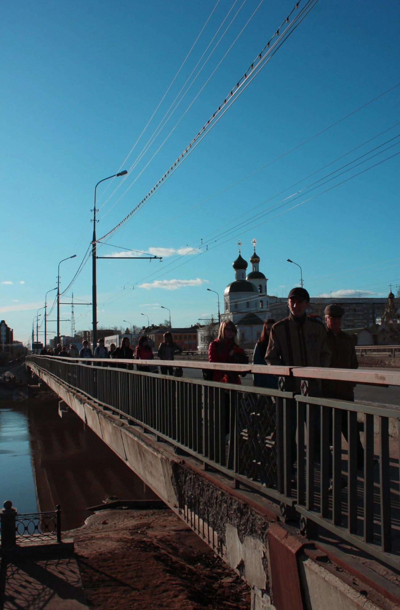 Под мостом видна спокойная гладь реки Малая Кокшага и её зелёные берега. По пешеходной части моста неспешно прогуливаются люди, наслаждаясь прекрасным видом на святыню. Чистое голубое небо с редкими облаками подчёркивает величие всего архитектурного ансамбля и создаёт ощущение мира и благодати.