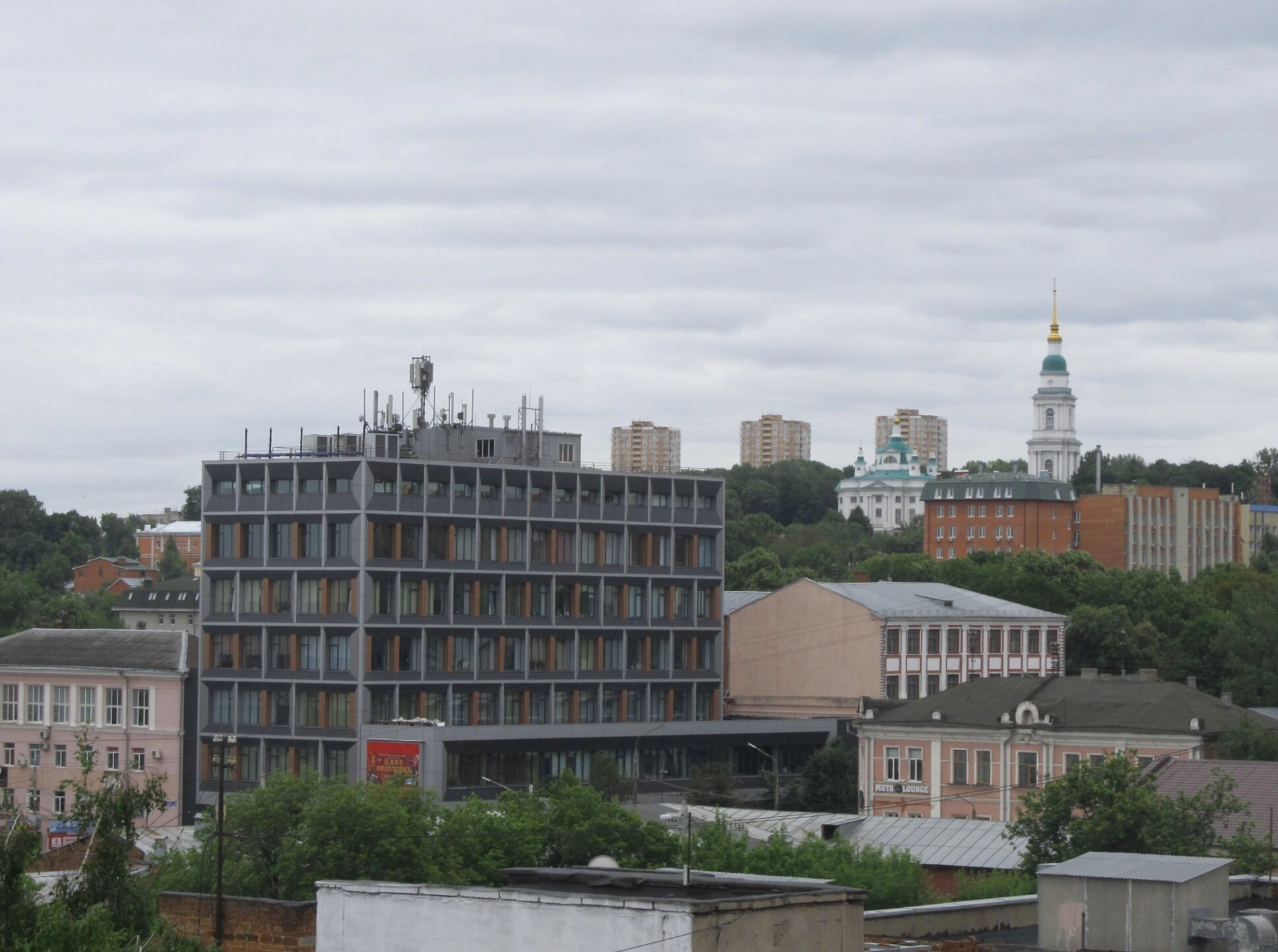 На переднем плане фотографии просматривается современное здание, являющееся частью креативного кластера «Октава», что создаёт интересный диалог между историческим наследием и новыми веяниями. Застройка среднего плана представляет собой смесь эпох: от старинных купеческих особняков до советских и современных зданий, что отражает богатую историю города. Обильная зелёная растительность, покрывающая склоны, смягчает городской ландшафт и придаёт ему уютный, обжитый вид.