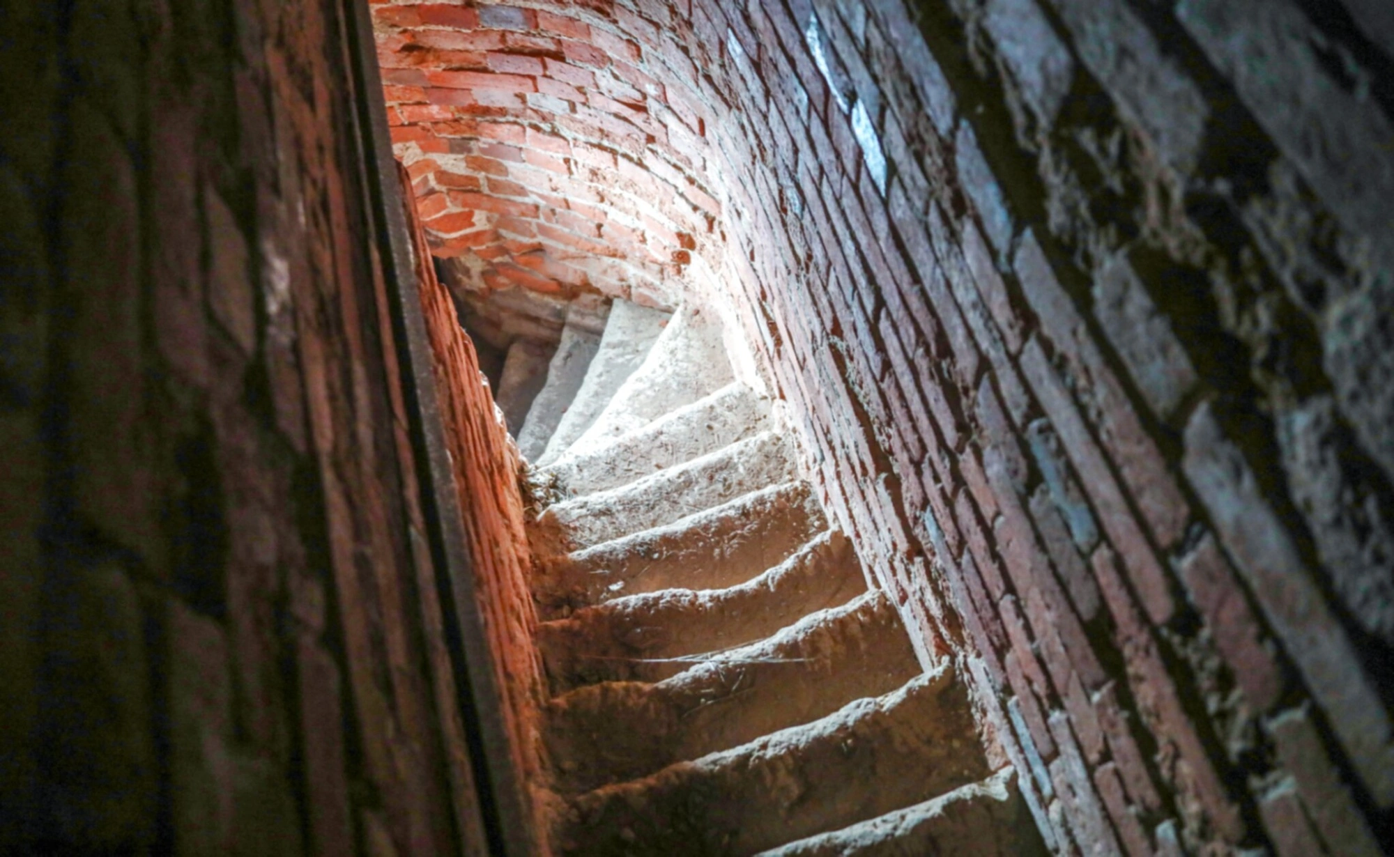 Лестница, выполненная из камня, ведёт на ярус звона колокольни, где размещаются церковные колокола. Её спиралевидная форма, заключённая в цилиндрический объём из красного кирпича, представляет собой характерный элемент храмовой архитектуры. Свет, проникающий сверху через оконные проёмы, освещает ступени, подчёркивая плавность изгибов конструкции и фактуру старинного кирпича, местами имеющего следы времени и естественного разрушения.