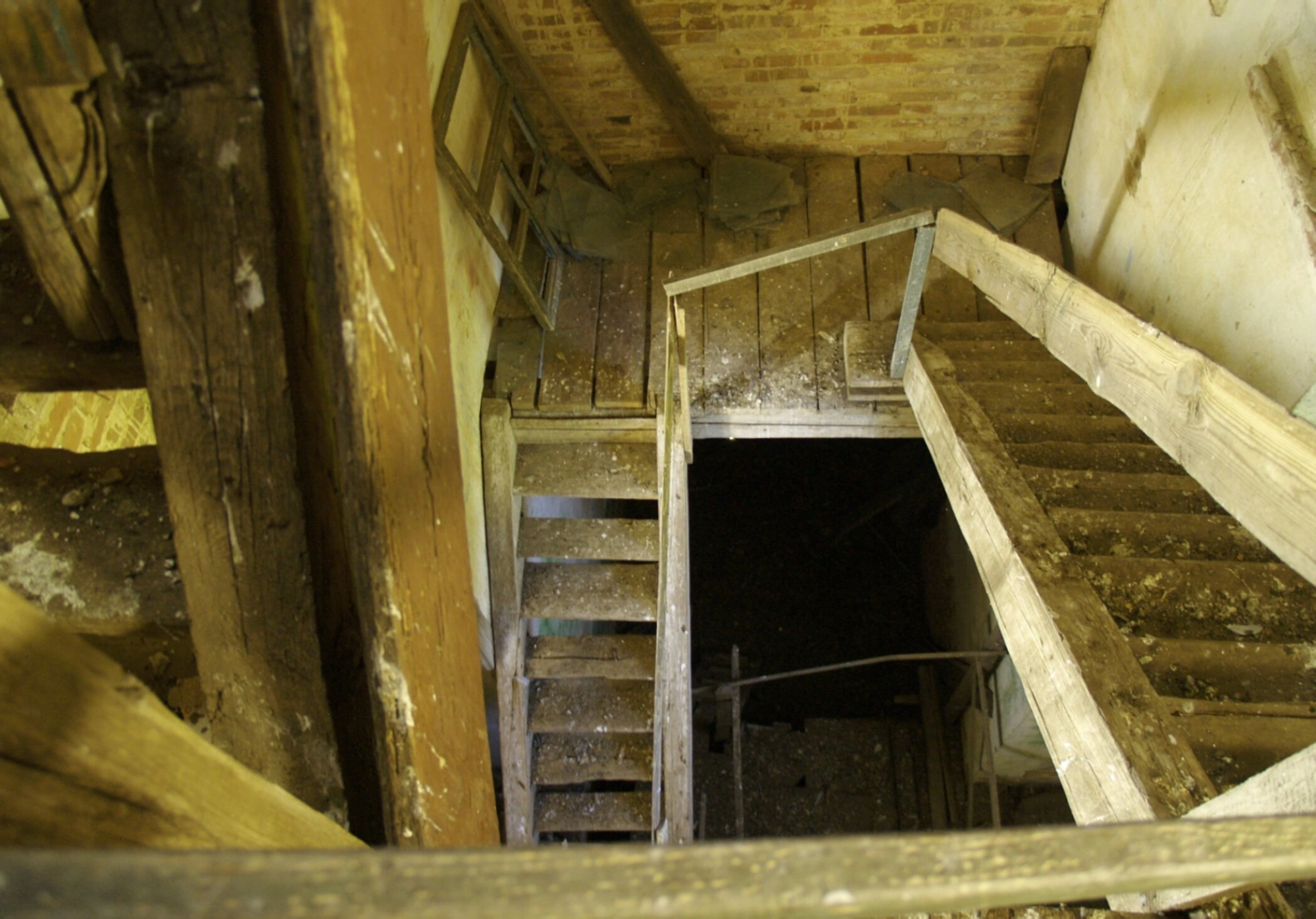 Деревянные конструкции, включающие в себя мощные балки, перекрытия и ступени, свидетельствуют о высоком мастерстве православных зодчих прошлого. Верхняя часть кадра открывает взору фрагмент кирпичной кладки, характерной для храмового строительства XVIII-XIX столетий. Естественное освещение, проникающее сквозь малое оконце, мягко ложится на поверхности, подчёркивая благодатную, но одновременно и скорбную атмосферу забвения.