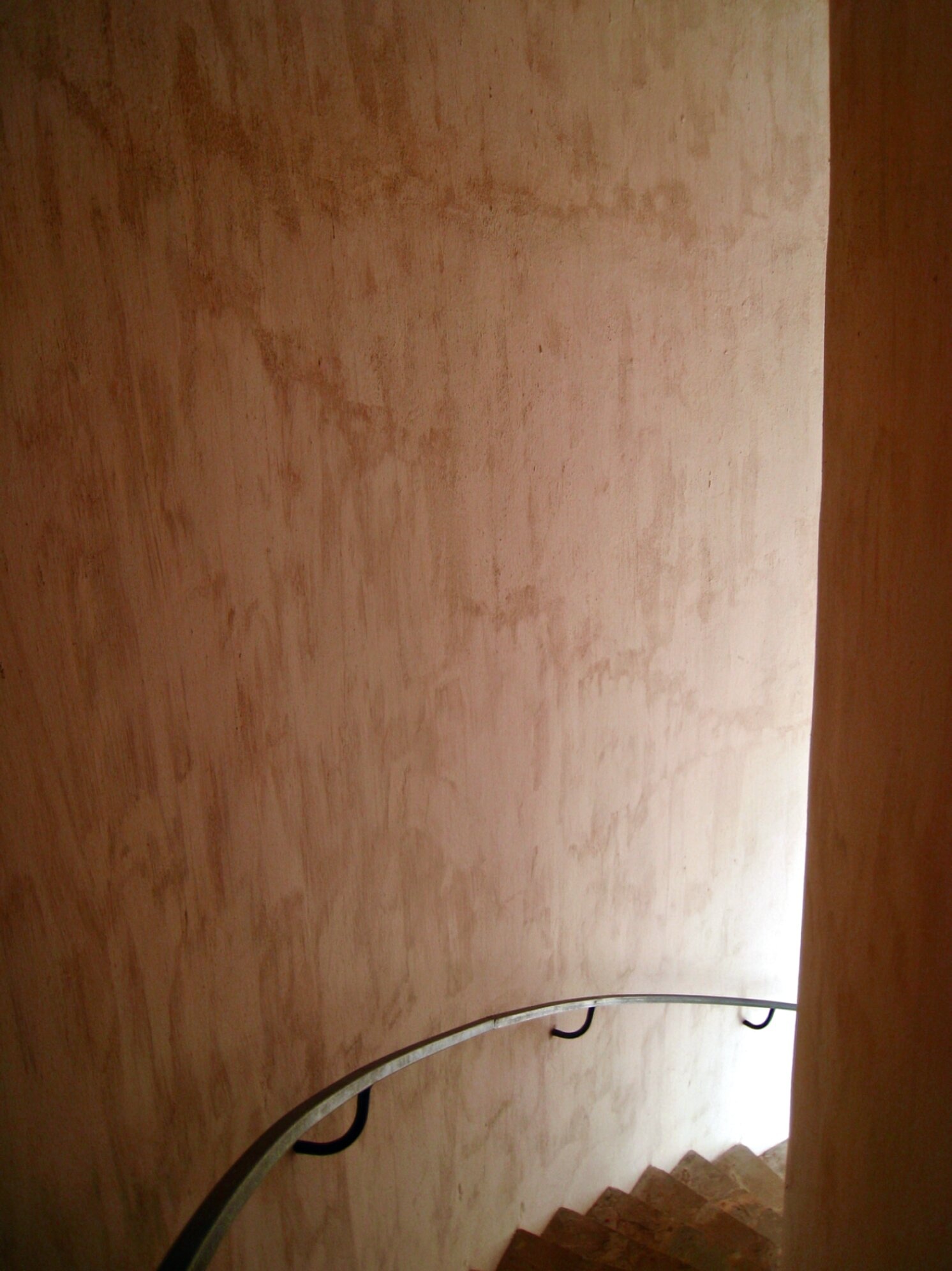 Стены, окружающие лестничный пролёт, оштукатурены и декорированы под рустованную каменную кладку, что характерно для храмовой архитектуры конца XVIII – начала XIX веков. Данный архитектурный приём создаёт ощущение надёжности, незыблемости и вечности, напоминая о прочности основ православной веры. Подобные элементы убранства были призваны подчеркнуть величие Дома Божия и создать особую, молитвенную атмосферу.