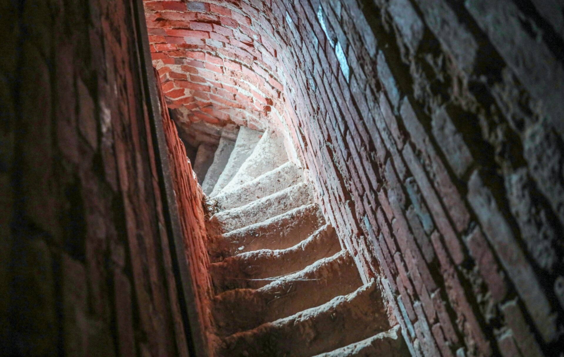Свод лестницы сложен из красного кирпича, местами имеющего следы естественного разрушения, что придает всему пространству особую, подлинную атмосферу старины. Естественный свет, проникающий сверху через специальные проёмы, мягко ложится на поверхность ступеней и кладки, выхватывая из полумрака фактуру материала и подчёркивая мастерство безвестных зодчих. Этот внутренний вид колокольни позволяет оценить не только красоту инженерной мысли, но и ту тихую, созерцательную жизнь, которая скрыта от внешнего взора.