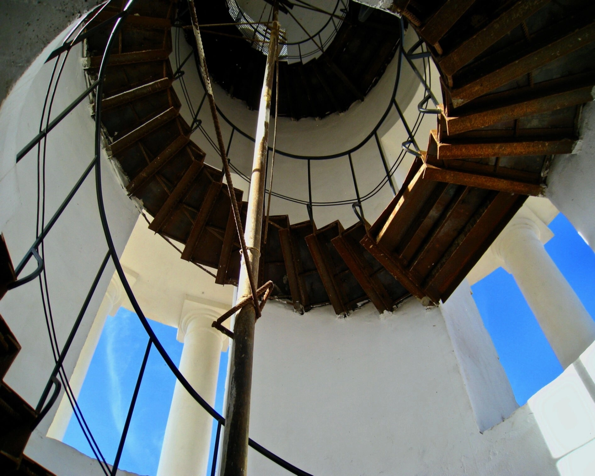 На представленном снимке запечатлён вид снизу вверх на внутреннее устройство колокольни храма во имя Святителя и Чудотворца Николая, что в подмосковной усадьбе Николо-Гагарино. В центре композиции — старинная винтовая лестница, ведущая на ярус звона. Её металлический каркас и деревянные ступени, хранящие память о прикосновениях многих поколений, создают особую атмосферу духовного восхождения.