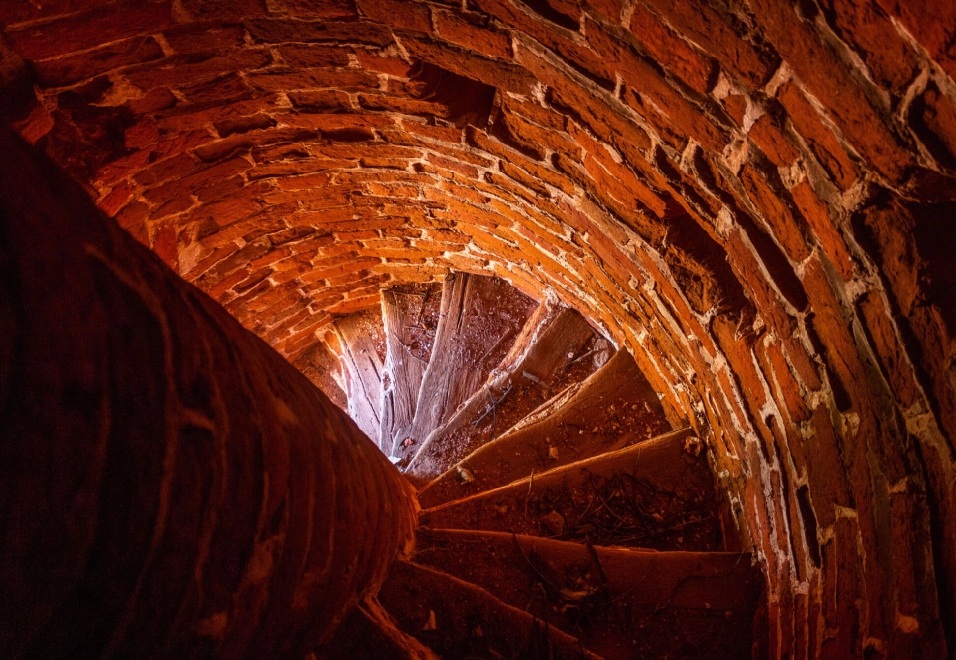 На представленной фотографии запечатлён уникальный архитектурный элемент — винтовая лестница, расположенная в колокольне действующего православного храма Покрова Пресвятой Богородицы в селе Борисово-Покровское. Эта каменная лестница, выполненная из кирпича, является не только функциональным сооружением, обеспечивающим доступ на ярусы звона, но и значимым образцом строительного мастерства.