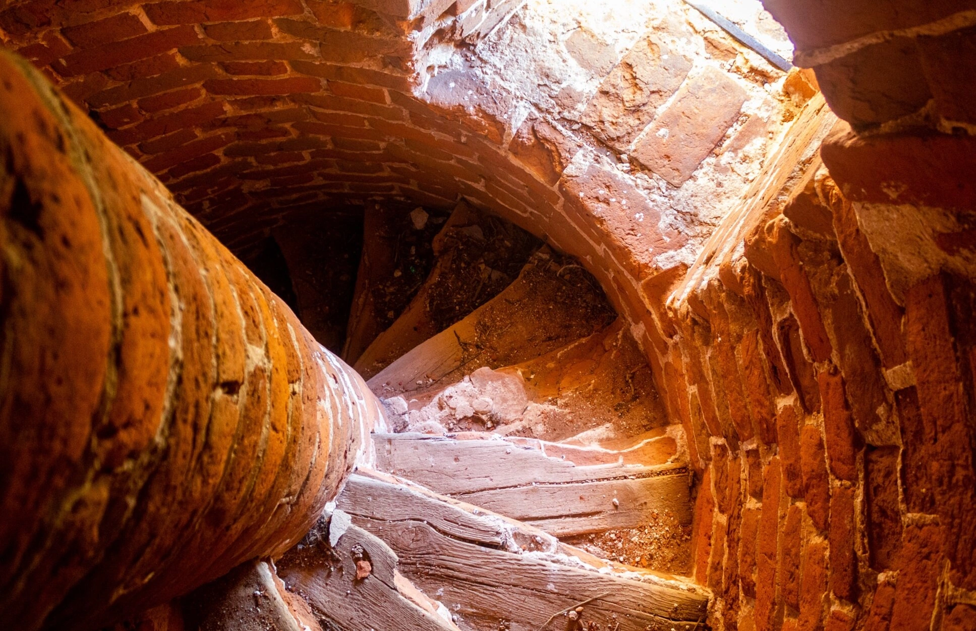 Лестничный марш искусно сложен из добротного красного кирпича, а ступени выполнены из прочного дерева, что свидетельствует о продуманной комбинации материалов для обеспечения крепости и долговечности. Крутой спуск в башенном объёме создаёт мощный визуальный эффект, уводящий взор вверх, к свету, символизирующему Божественное присутствие и духовное восхождение.