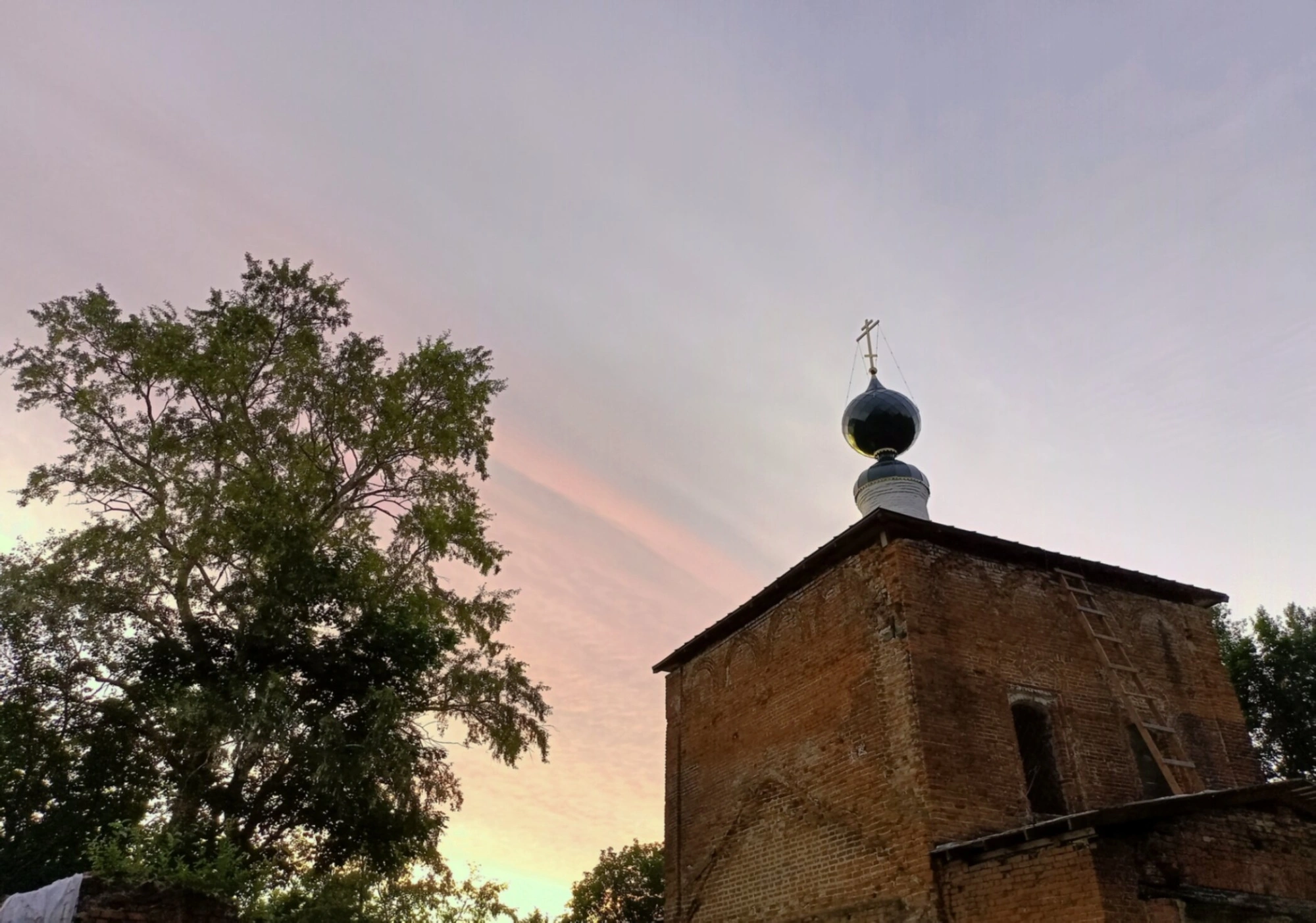 Рядом с храмом располагается вековое дерево, которое служит естественным обрамлением для святыни. На снимке церковь изображена на фоне вечернего неба, что создает особую молитвенную атмосферу и подчеркивает духовное значение этого места. Теплые тона закатного неба гармонично сочетаются с красно-коричневой кладкой храмовых стен.