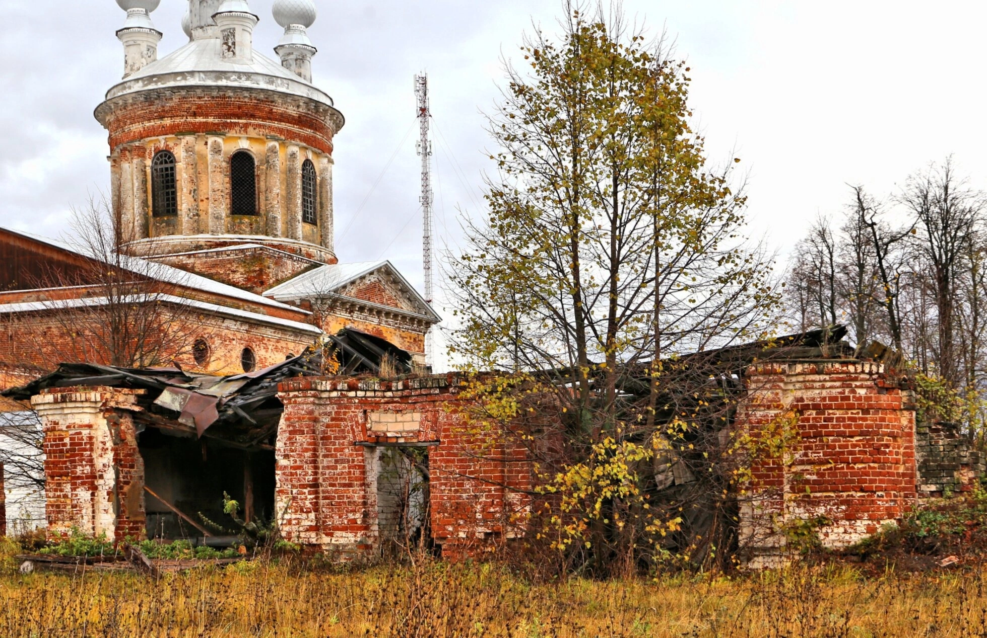 Окружающий пейзаж подчеркивает заброшенность святого места. Пожухлая осенняя трава и оголенные деревья создают меланхоличную атмосферу. На заднем плане видна современная вышка сотовой связи, составляющая разительный контраст с древними стенами храма.