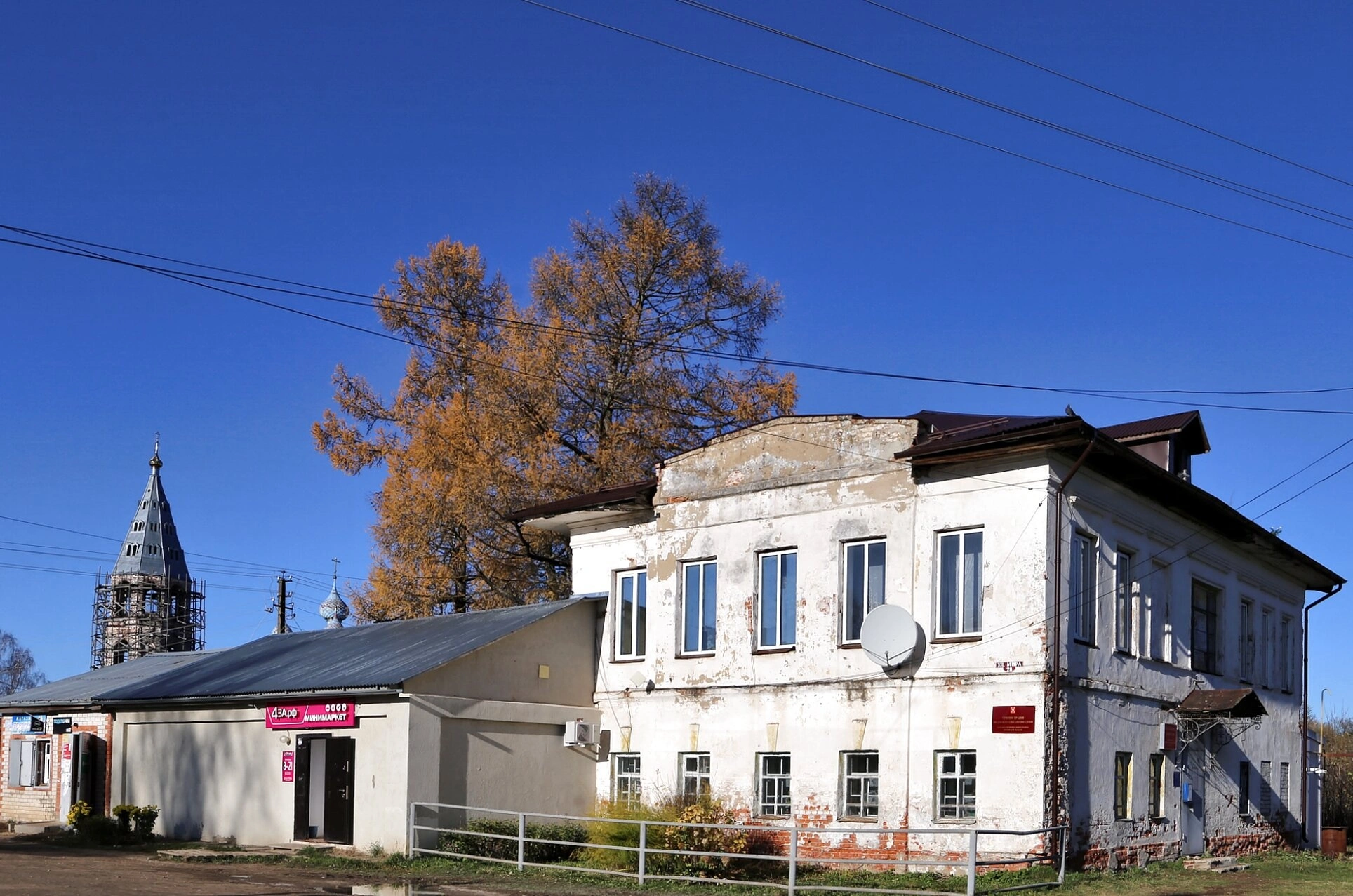 На представленной фотографии запечатлён архитектурный ансамбль Владимирской зимней церкви в селе Введеньё Шуйского района Ивановской области. На переднем плане изображено двухэтажное белокаменное здание с характерными признаками исторической постройки, где некогда размещались церковные административные помещения. Фасад здания демонстрирует следы времени – местами облупившаяся штукатурка свидетельствует о почтенном возрасте строения.