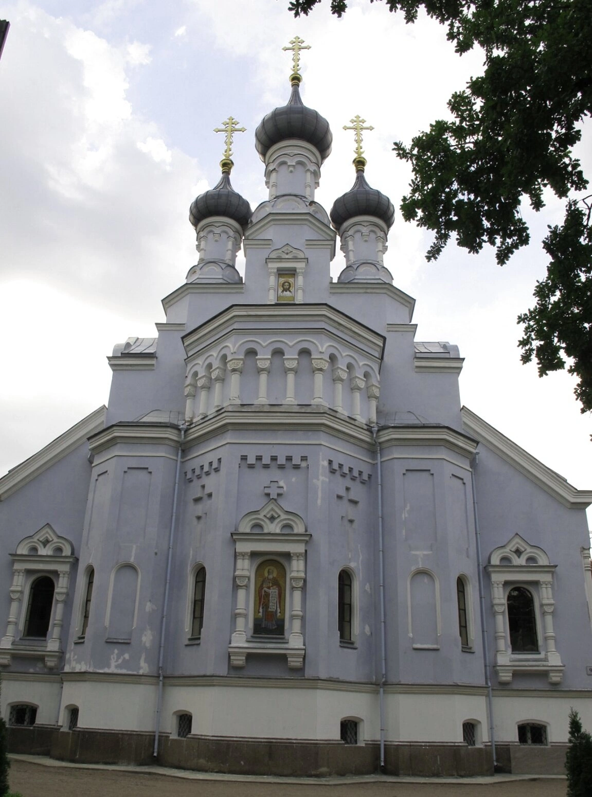 Архитектура собора, возведённого в 1875–1879 годах по проекту Давида Гримма под руководством академика Христиана Грейфана, относится к русскому стилю. Храм представляет собой пятинефную базилику с высокой 50-метровой колокольней. Фасадное убранство включает лепные кокошники, картуши для икон и арочные окна. Иконы для внешнего оформления были заказаны Обществу русских художников, а медные вызолоченные кресты изготовлены по рисунку Грейфана.
