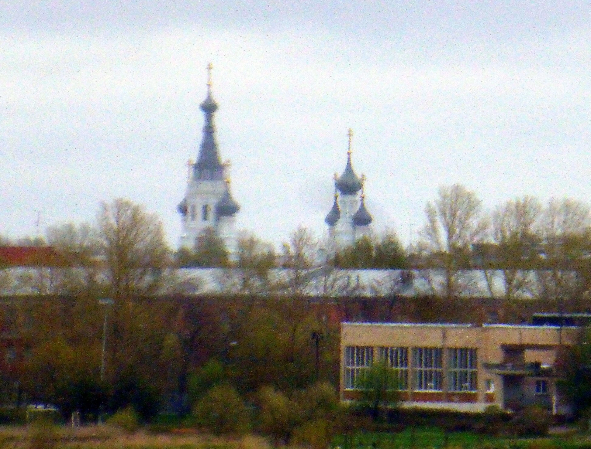 На представленной фотографии запечатлён Владимирский собор в Кронштадте — величественный православный храм во имя Владимирской иконы Божией Матери. Снимок передаёт архитектурное величие собора: высокая колокольня со шпилем, увенчанным крестом, и несколько куполов с крестами. Фасады выдержаны в светлых тонах, что характерно для русской храмовой архитектуры. На переднем плане видны деревья с редкой листвой, возможно, съёмка проводилась в межсезонье. Также в кадре присутствует одноэтажное здание с большими окнами, вероятно, относящееся к церковному комплексу. За собором просматриваются другие городские постройки, а небо покрыто облаками, создавая спокойное, немного сумрачное настроение.