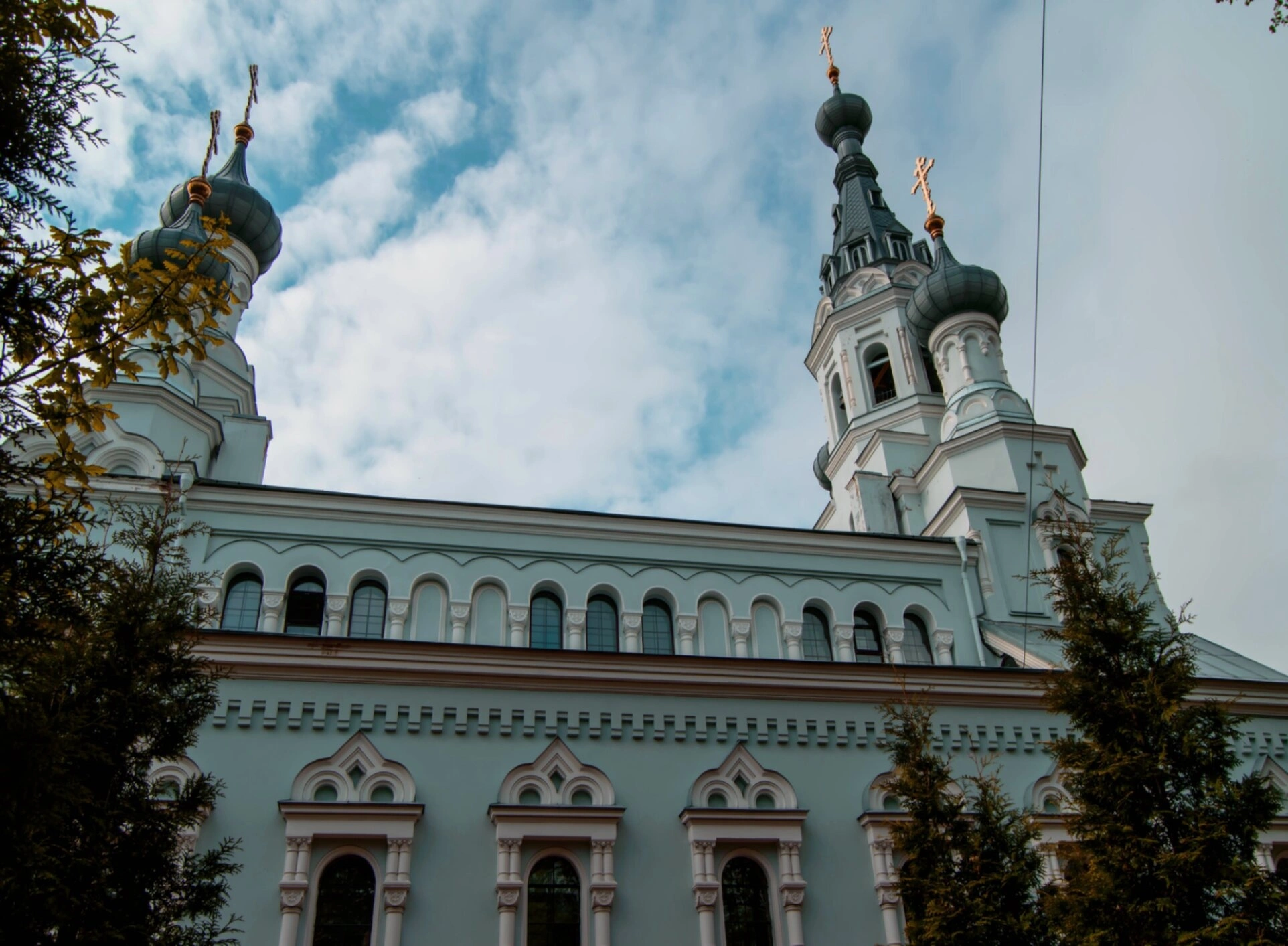 На представленной фотографии запечатлен величественный фасад Собора Владимирской иконы Божией Матери в Кронштадте. Храм, возведенный в русском стиле, предстает перед зрителем в своем благолепии. Его стены окрашены в небесно-голубой цвет, а белоснежные архитектурные детали — карнизы, наличники и колонки — создают торжественный и строгий образ. Над основным объемом возносятся два главных купола: левый — серый, правый — увенчанный темным шатром с сияющим золотым крестом. Ряд меньших главок дополняет живописную симфонию верхов.