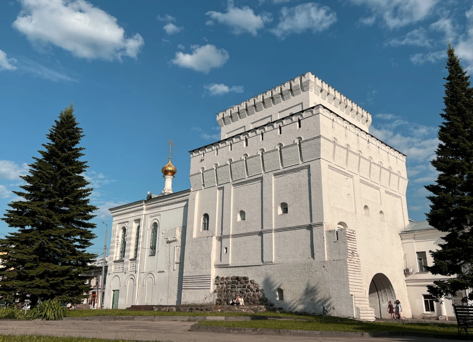 На представленной фотографии запечатлён уникальный архитектурный ансамбль в историческом центре Ярославля — Власьевская башня с возвышающейся над ней церковью в честь иконы Божией Матери «Знамение». Этот выдающийся памятник истории и культуры является одним из символов древнего города, гармонично соединившим в себе светское оборонительное зодчество и православное храмовое строительство.