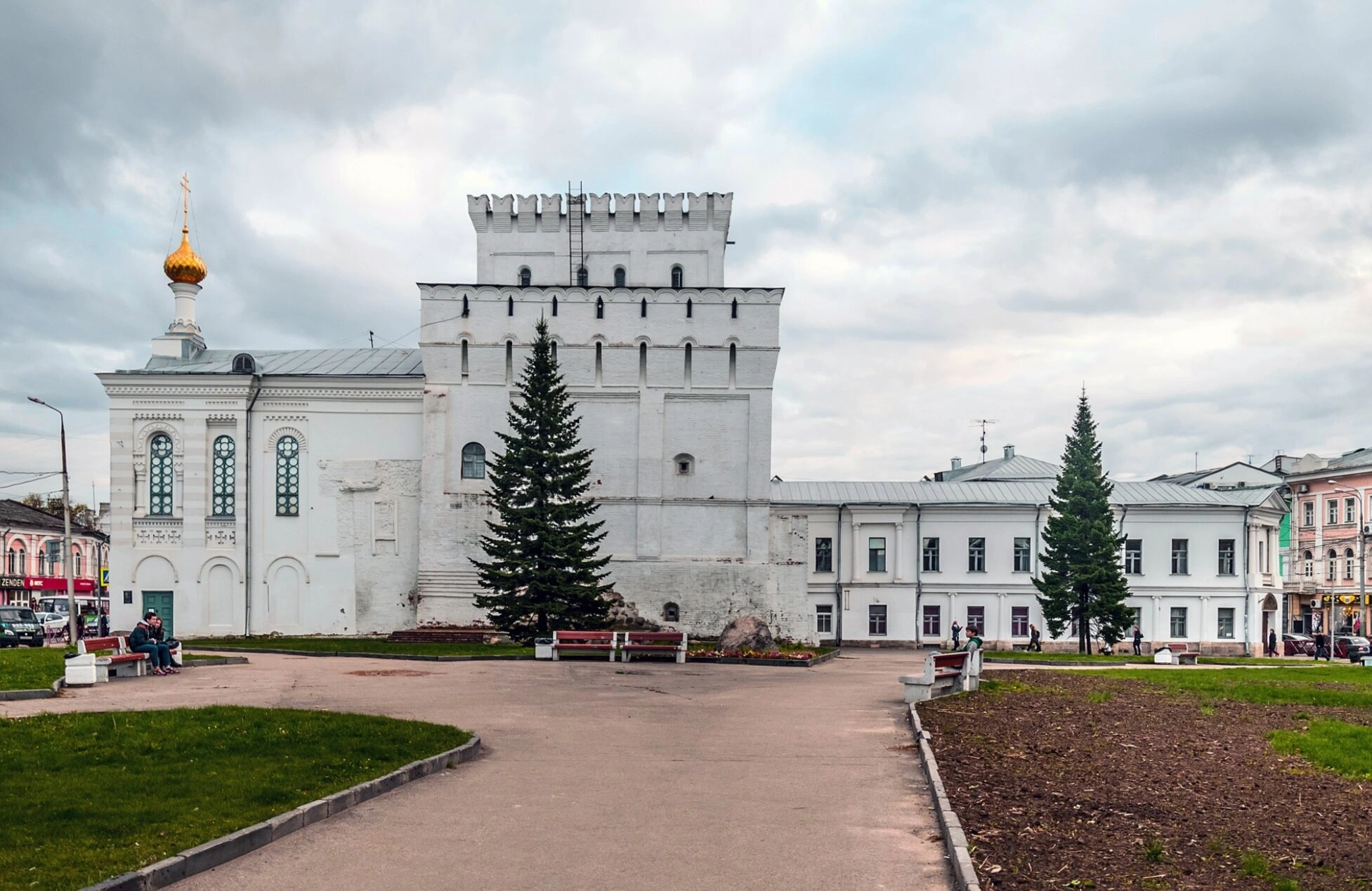 На представленной фотографии запечатлена Власьевская башня, также известная как Знаменская, — одна из двух сохранившихся башен древних укреплений Земляного города Ярославля. К монументальному сооружению XVII века примыкает белоснежная Церковь иконы Божией Матери «Знамение», создающая уникальный архитектурный ансамбль.