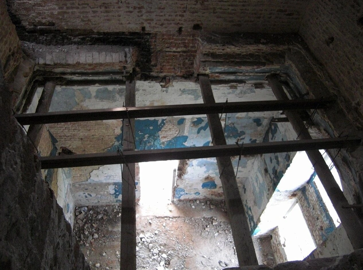 Нижние ярусы здания практически полностью скрыты под грудами обломков и строительного мусора, что свидетельствует о длительном периоде забвения. Единственным источником освещения в этом полуразрушенном пространстве служит дневной свет, проникающий сквозь зияющие проёмы в стенах, где некогда находились оконные рамы с витражами.