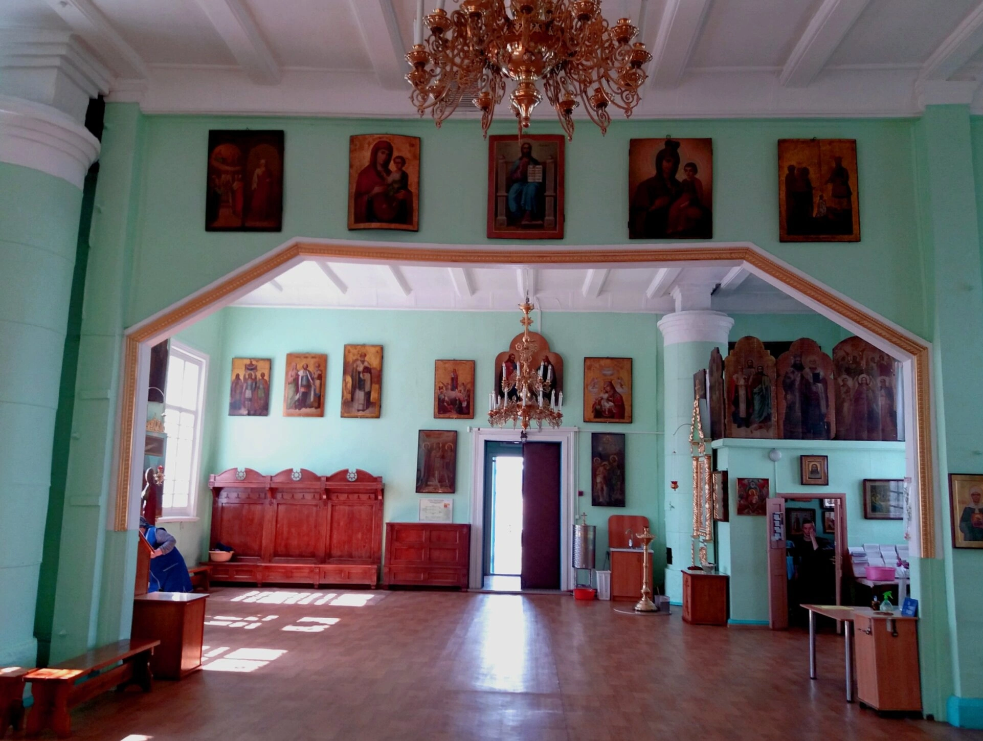 По периметру храма размещены многочисленные иконы в киотах, создающие целостный молитвенный ансамбль. Архитектурное пространство организовано с использованием высоких колонн и арочных проемов, характерных для церковного зодчества. Освещение обеспечивается большой центральной люстрой, символизирующей небесный свет, и дополнительными светильниками, расположенными в боковых частях храма.