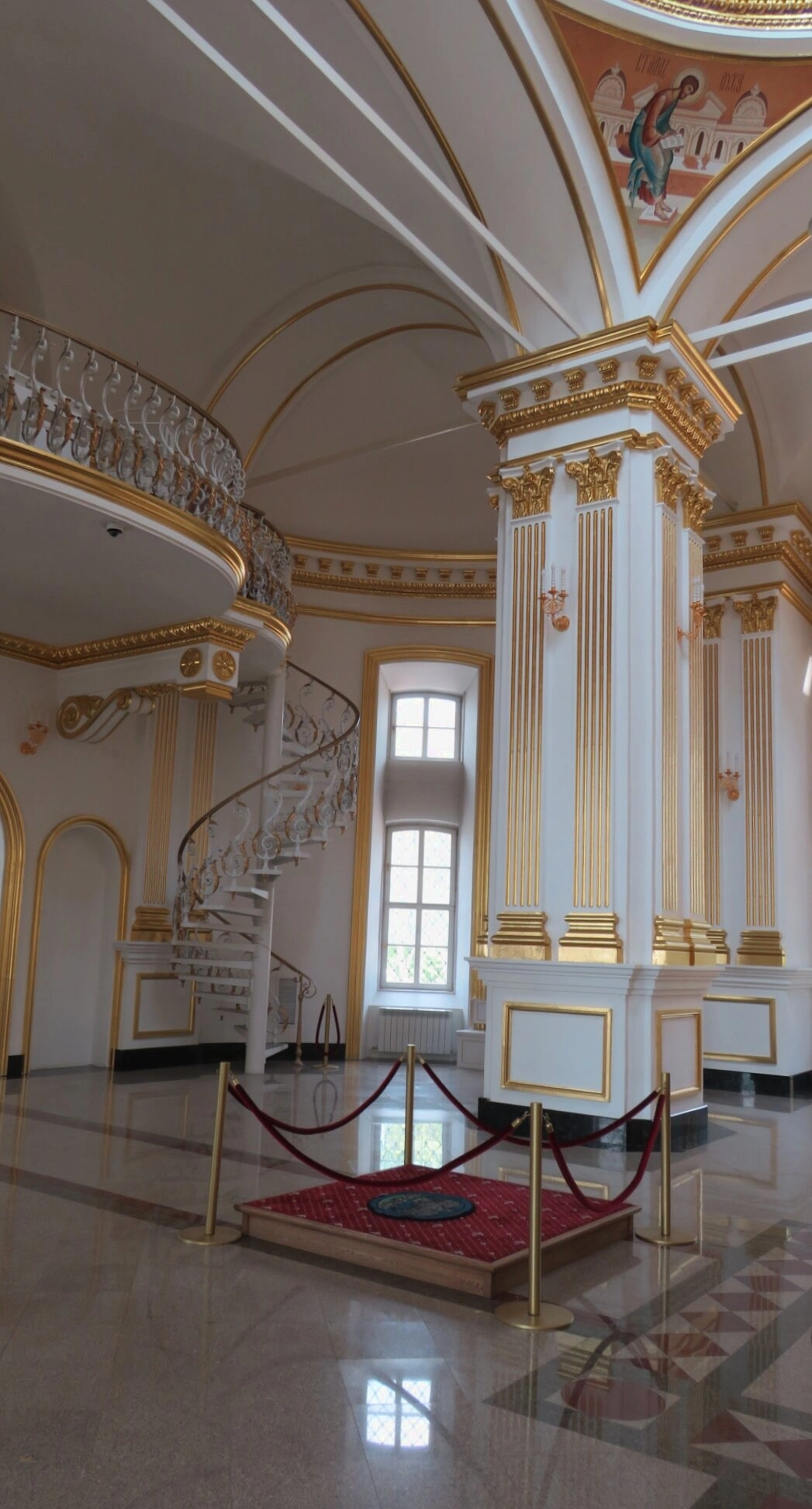 Красная ковровая дорожка, проложенная по мраморному полу, символизирует путь к алтарю и придаёт интерьеру царственное величие. Общая атмосфера благоговейной торжественности, характерная для древних православных соборов, передаёт духовную значимость этого места. Каждый архитектурный элемент и деталь убранства свидетельствуют о высоком искусстве русских зодчих и иконописцев, создавших этот уникальный храмовый комплекс.