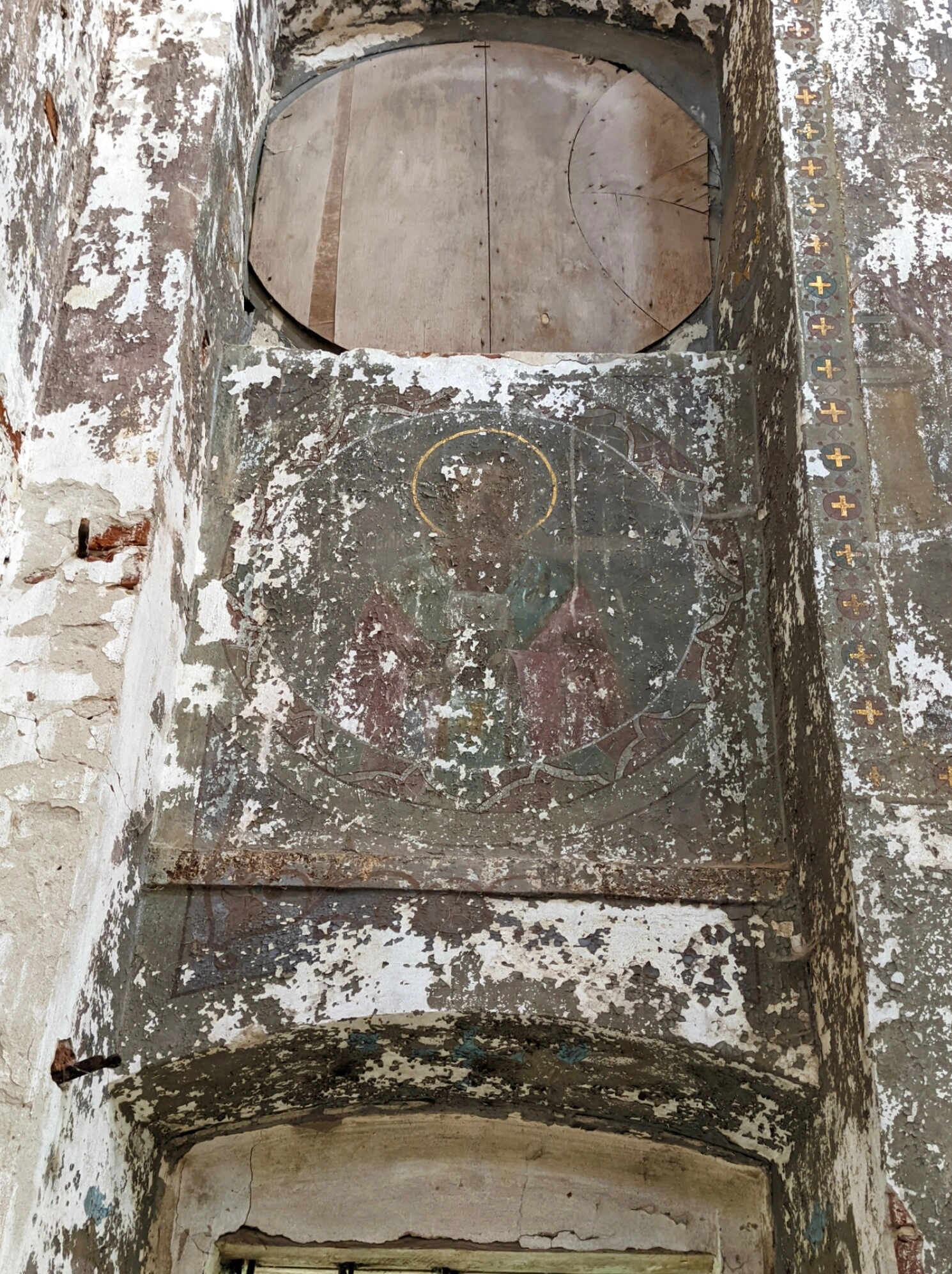 В центре композиции вниманию предстает поврежденная временем фресковая роспись, на которой просматриваются священные изображения. Угадываются образы двух святых, пребывающих в сиянии нимбов, что свидетельствует об их духовной просветленности. Выше расположен заложенный оконный проем, ныне закрытый деревянными щитами, что характерно для храмов, переживших различные исторические периоды.
