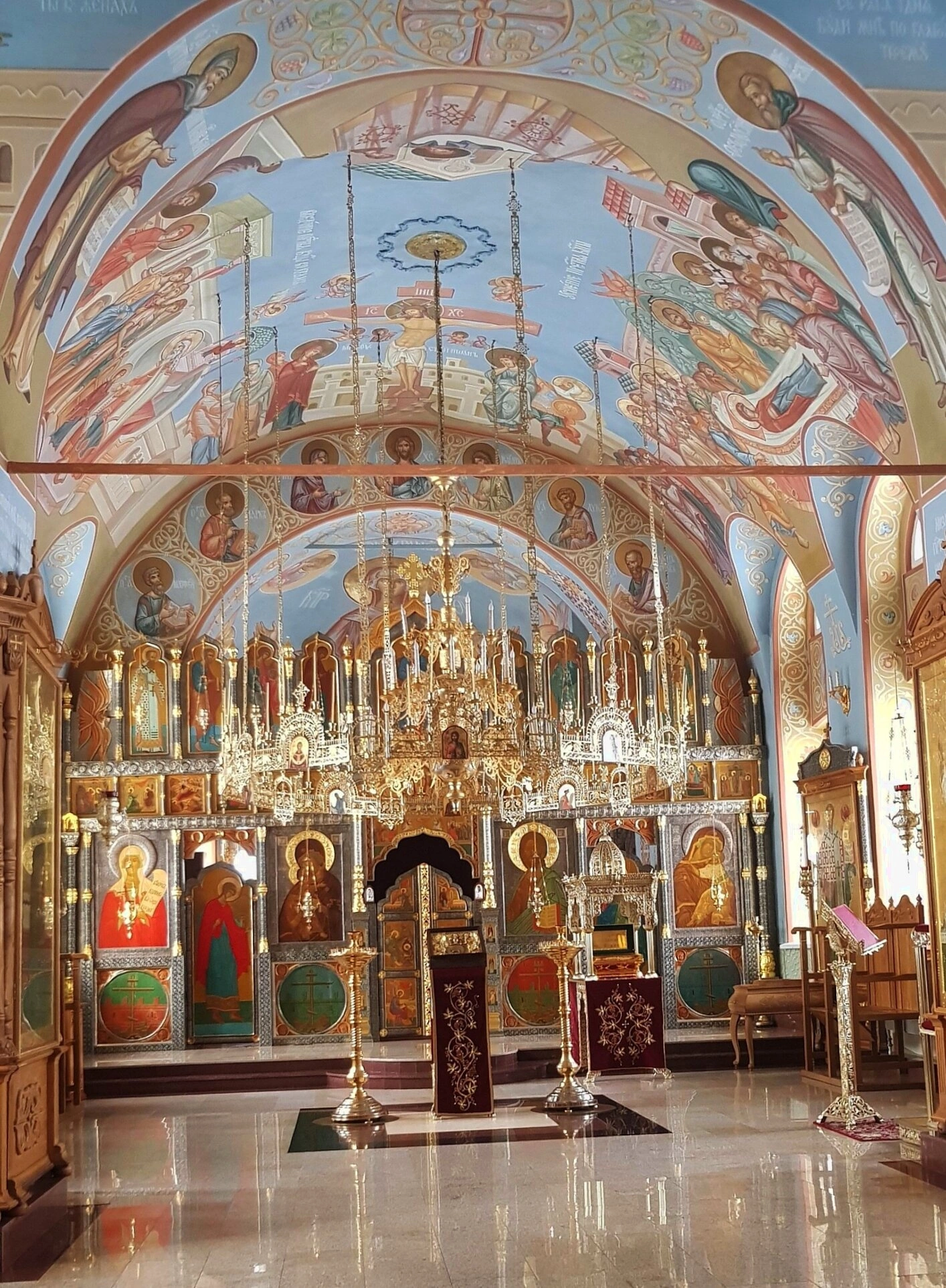 Освещение храмового пространства обеспечивают массивные золочёные паникадила, свисающие с центрального свода. Их торжественный свет отражается в позолоте иконостаса и окладов икон, усиливая ощущение величия и благодати. В интерьере также различимы традиционные элементы церковной утвари: аналои, подсвечники, что подчёркивает предназначение этого места для совершения богослужений и личной молитвы.