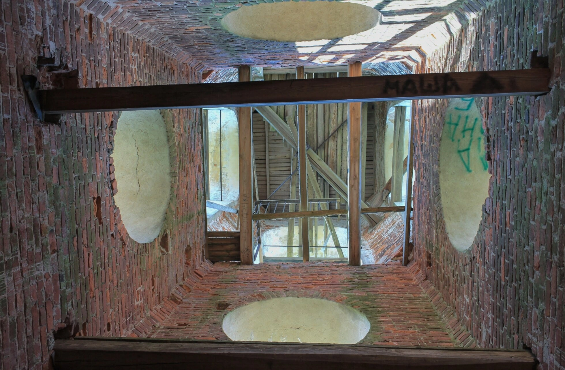 Особый интерес представляет сохранившаяся деревянная конструкция в верхней части снимка, являющаяся элементом стропильной системы или основанием для колоколов. На одной из балок просматривается граффити с надписью "MAWA", что может указывать на различные исторические периоды использования сооружения.
