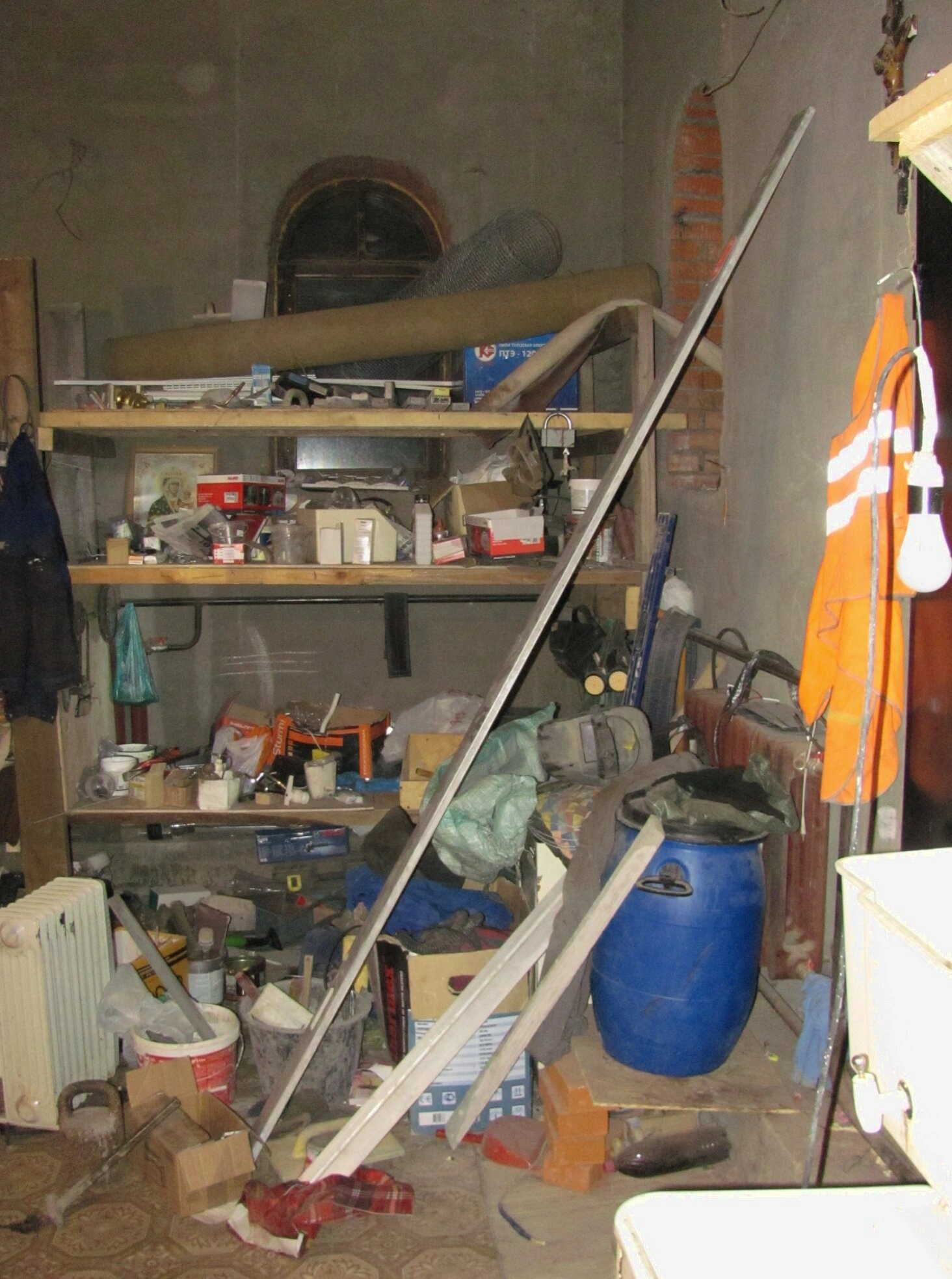 На фотографии видны стеллажи с церковной утварью, банками с лакокрасочными материалами, строительными инструментами и другими предметами, необходимыми для содержания и поддержания храма. В центральной части помещения расположена синяя пластиковая ёмкость, вероятно используемая для хозяйственных нужд. Справа на снимке присутствует рабочая одежда оранжевого цвета, что свидетельствует о ведении активных работ по благоустройству церковной территории.