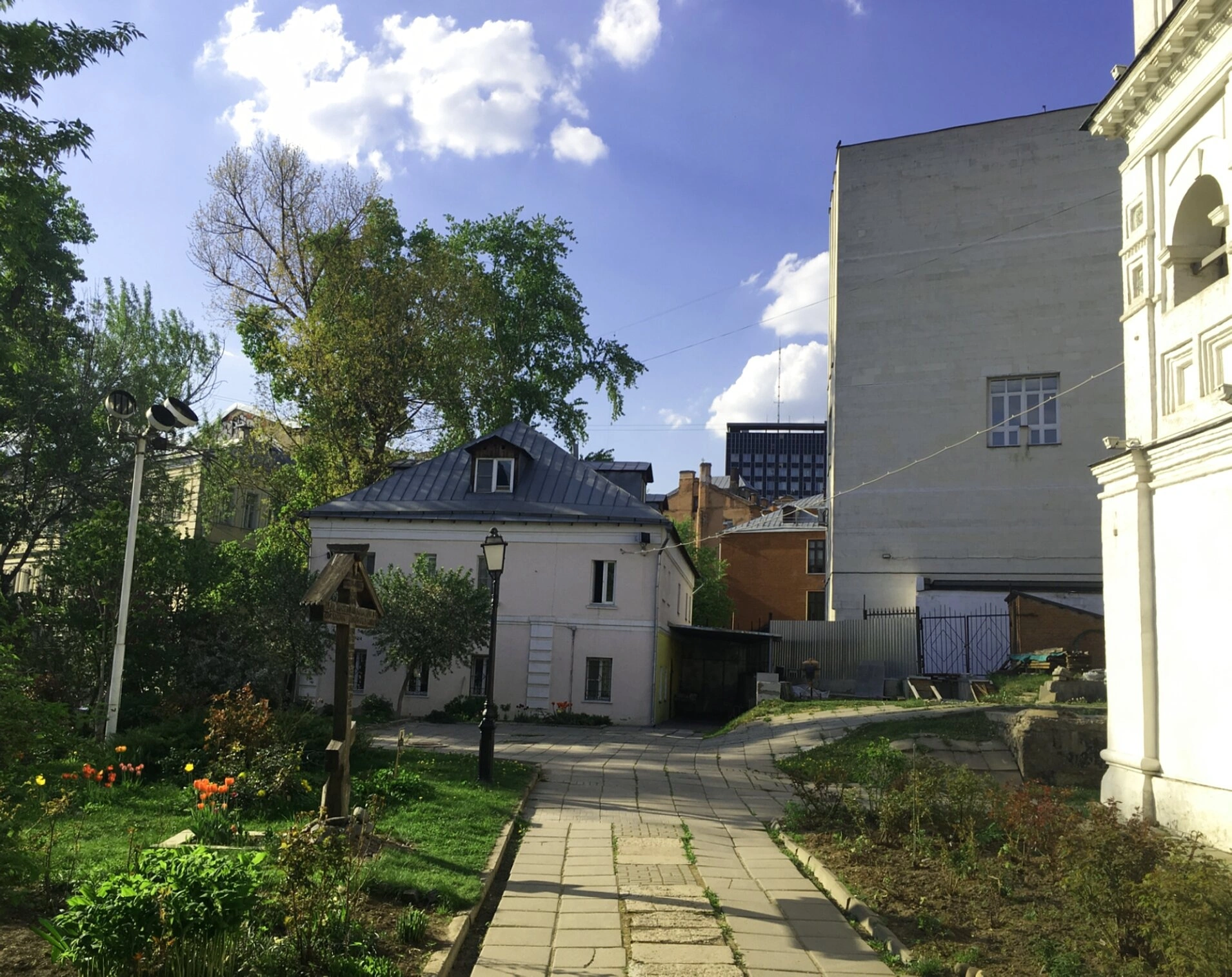На представленной фотографии запечатлен внутренний двор храма Святого равноапостольного князя Владимира, расположенного в историческом районе Москвы — Старые Сады. Святыня находится в Басманном районе по координатам 55.755399, 37.640496.