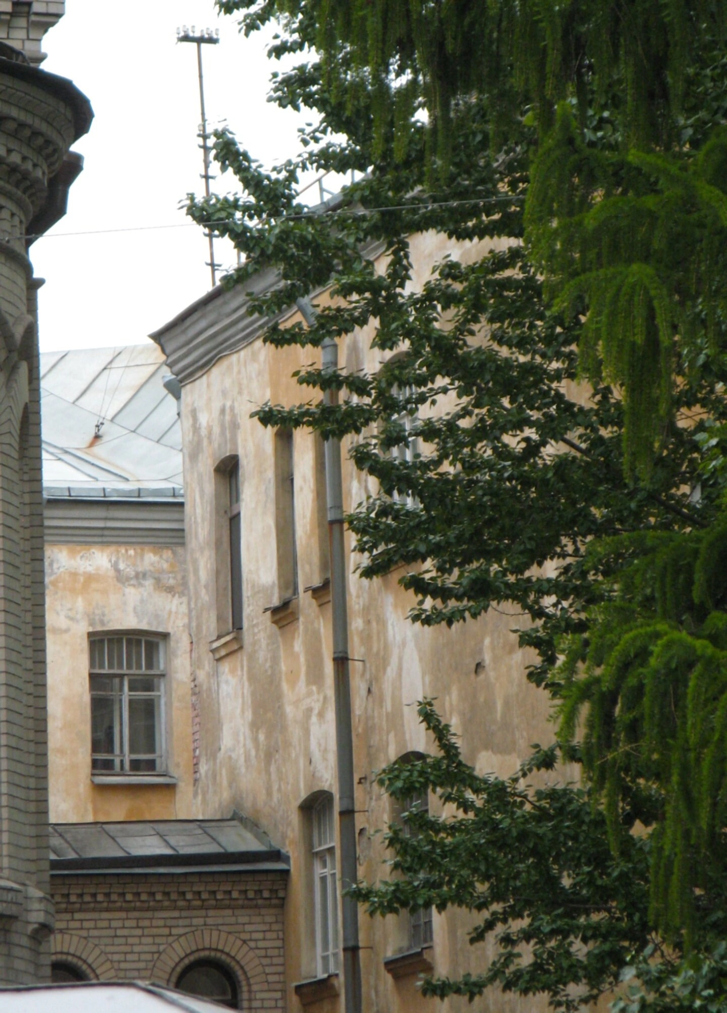 На представленной фотографии запечатлён внутренний двор (или узкий проход) между старыми зданиями подворья Валаамского монастыря в Санкт-Петербурге. В кадре видны стены с потрескавшейся желтой штукатуркой, простые прямоугольные окна, водосточная труба, спутниковая антенна на крыше и металлическая кровля. Справа обильная зелёная листва дерева создаёт тенистый образ. Общий вид передаёт атмосферу старинного церковного комплекса.