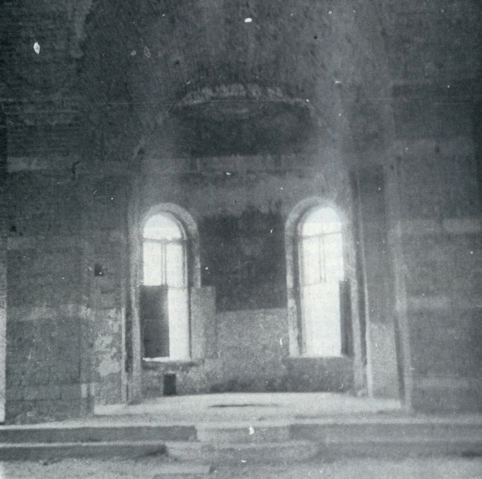 Стены и своды алтарной части сохранили следы былого благолепия, однако многочисленные повреждения штукатурного слоя и отсутствие完整的装饰ного убранства свидетельствуют о длительном периоде разрушения. Пол храма покрыт слоем строительного мусора и природных наслоений, что добавляет драматизма восприятию священного пространства.