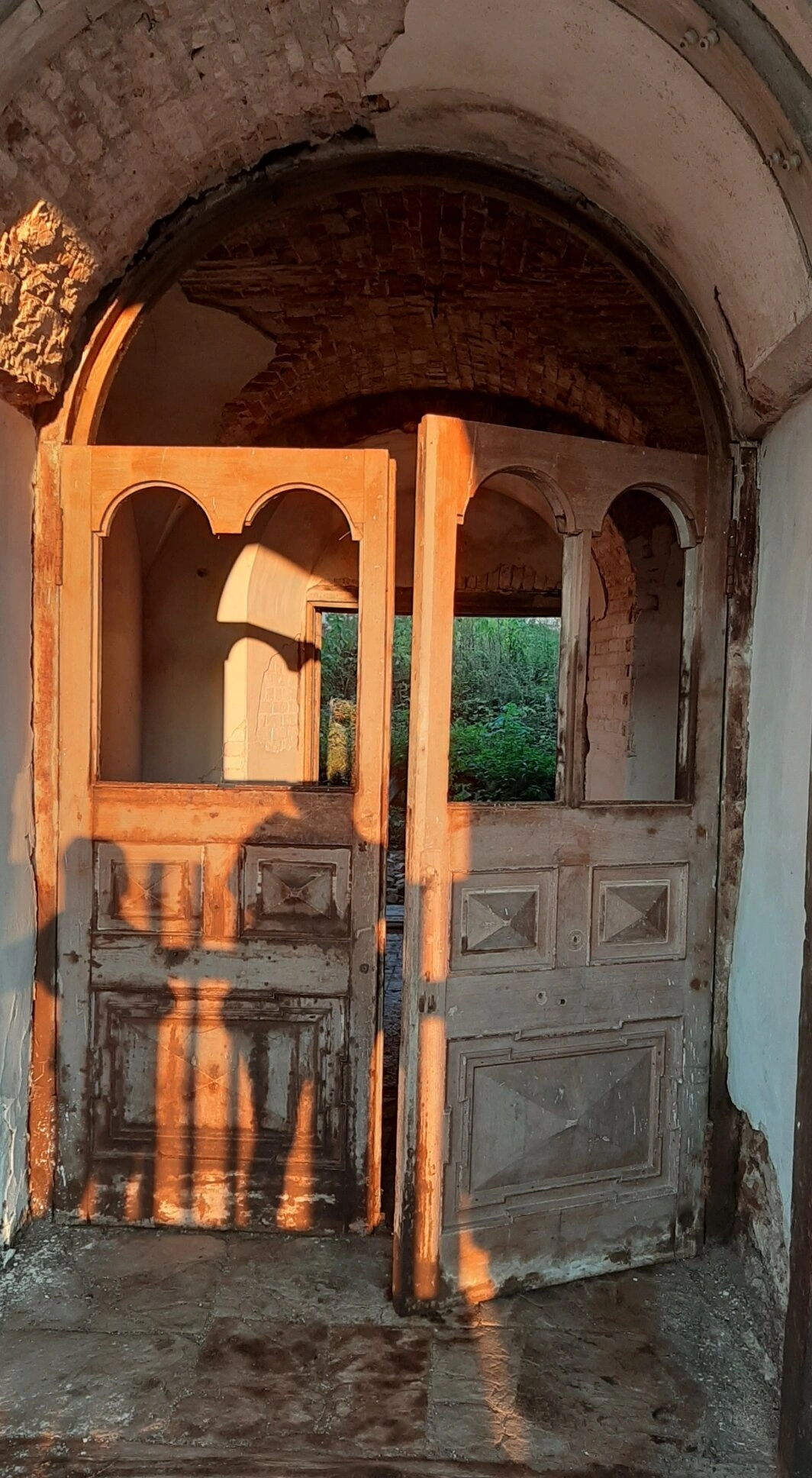 В центре композиции находится большой арочный оконный проем, через который в некогда освященное пространство проникает дневной свет. Проем разделен двумя старинными деревянными оконными рамами, верхняя часть которых повторяет форму арки. Дерево рам, покрытое слоем облупившейся краски, истерзано временем, но сохраняет следы былого мастерства исполнения.