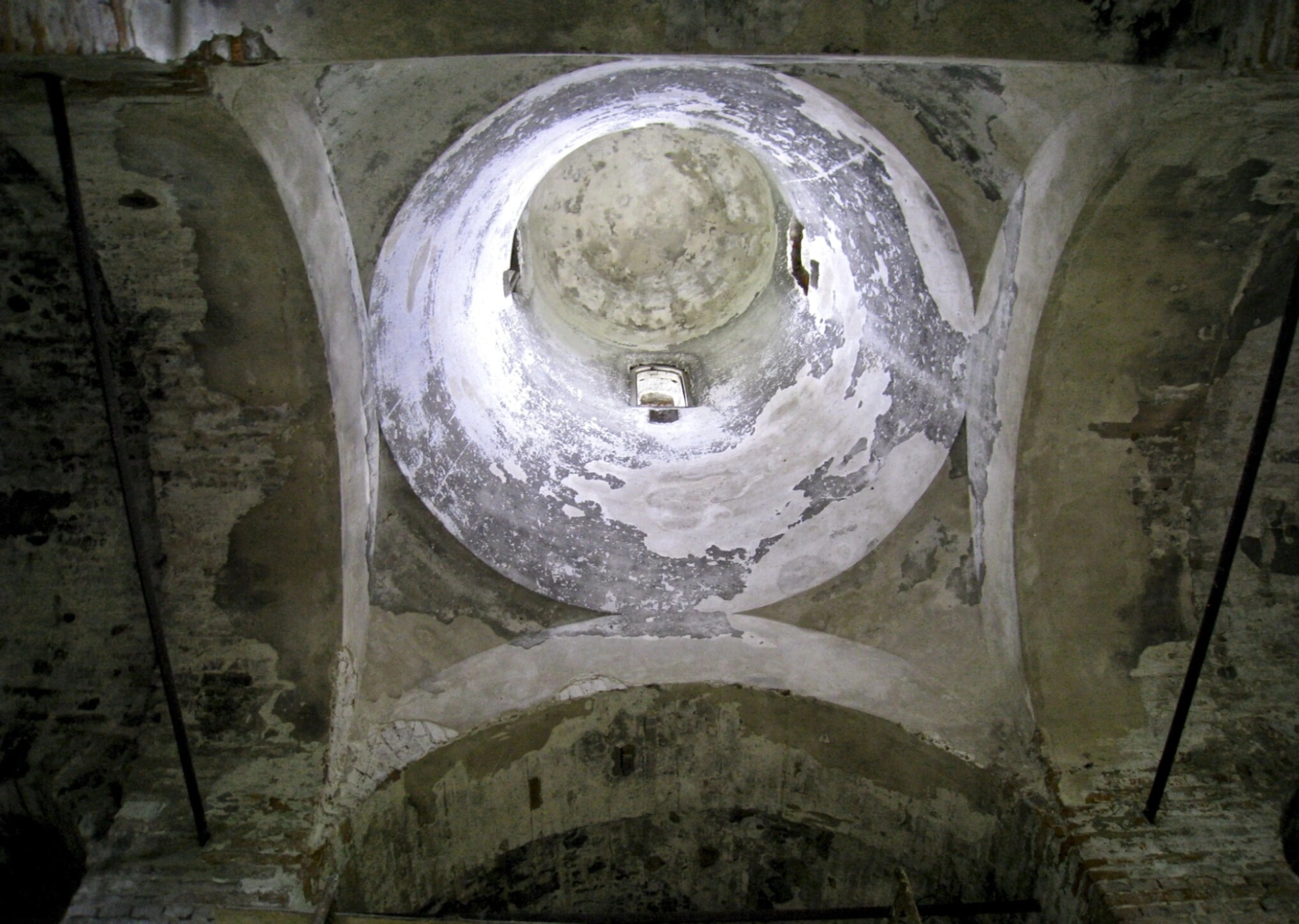 Основное внимание приковывает величественный купольный свод, венчающий пространство храма. В его вершине располагается круглое основание, или световой барабан, через который некогда проникал дневной свет, озаряя молитвенное собрание. Ныне эта конструкция, как и окружающие её подпружные арки, демонстрирует следы разрушения: штукатурный слой местами обрушился, обнажив древнюю кирпичную кладку тёплого оттенка. Игра света и тени, падающая сверху, художественно высвечивает текстуру материалов, подчёркивая каждую трещину и след влаги, создавая картину глубокой, но не лишённой духовной силы, запустенности.