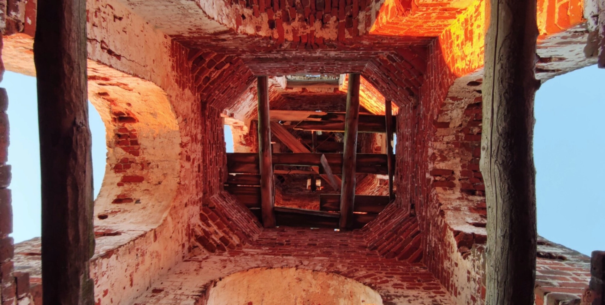Освещение внутреннего пространства создаётся солнечными лучами, проникающими сквозь арочные проёмы в верхней части колокольни. Естественный свет мягко ложится на кирпичные стены, выявляя богатую фактуру материала и создавая тонкую игру светотени. В просветах между конструкциями виднеются фрагменты голубого неба, символически напоминая о связи земного храма с горним миром.